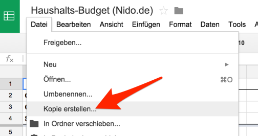 Melden Sie sich bei Google an und klicken sie auf diesen Link. Die Haushaltsbuchvorlage öffnet sich. Klicken sie auf „Datei“->“Kopie erstellen“ und vergeben Sie einen Namen für ihr Haushaltsbuch. Danach haben Sie in ihrem persönlichen Google-Account eine Kopie des Haushaltsbuches mit dem Sie ab jetzt arbeiten.