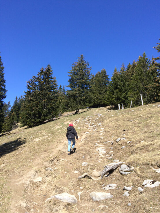 Vom Parkplatz aus laufen wir die geteerte Straße bergauf bis zur Unteren Firstalm (s. auch Rodeln von der Oberen Firstalm). Bis hierhin ist der Weg noch kinderwagengeeignet.