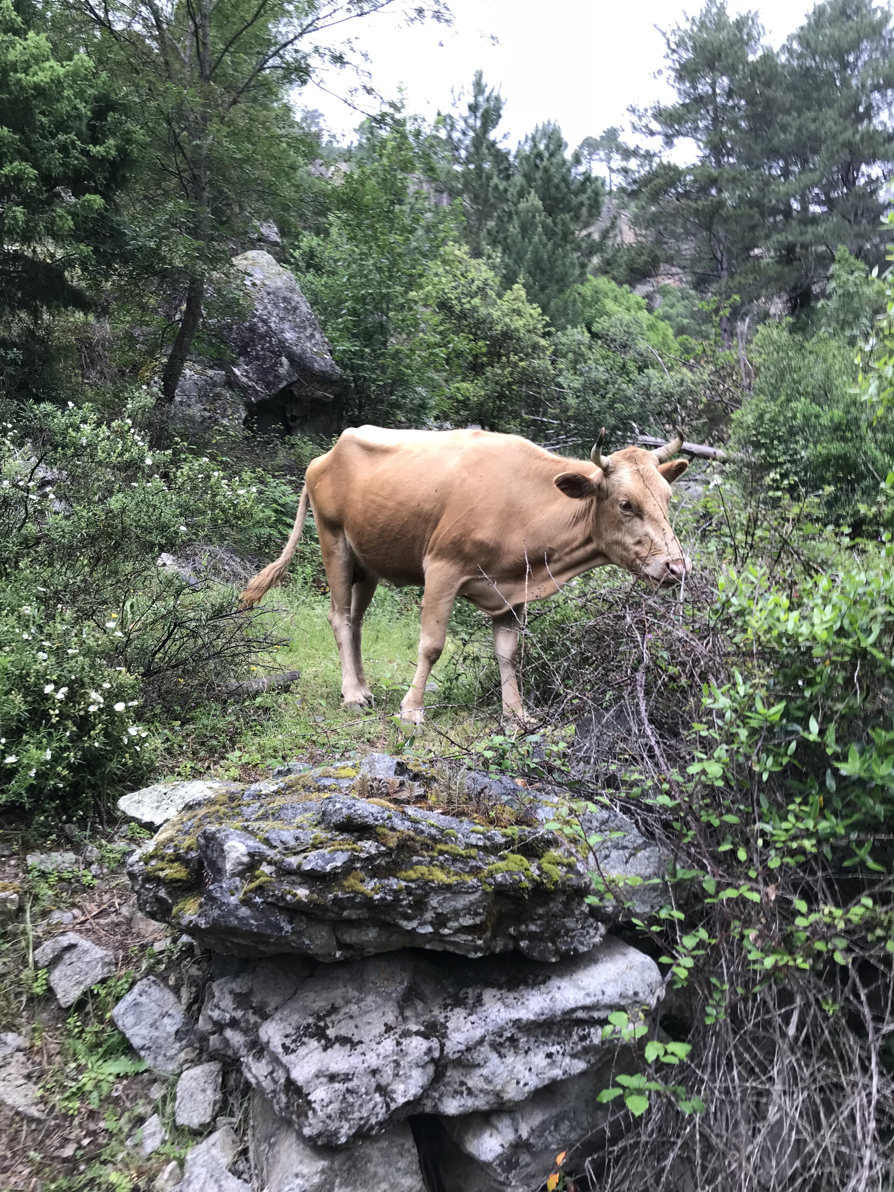 Und zwar nicht auf eingezäunten Weiden, sondern einfach so. Es ist üblich, dass die markierten Tiere frei in der Gegend herumlaufen. V.a. auf den engen, steilen Bergstraßen im Landesinneren muss man eigentlich ständig damit rechnen, dass hinter der nächsten Kurve ein Kuh oder ein Pferd steht. Aber auch auf sehr engen Wanderwegen und am Strand haben wir Kühe getroffen.