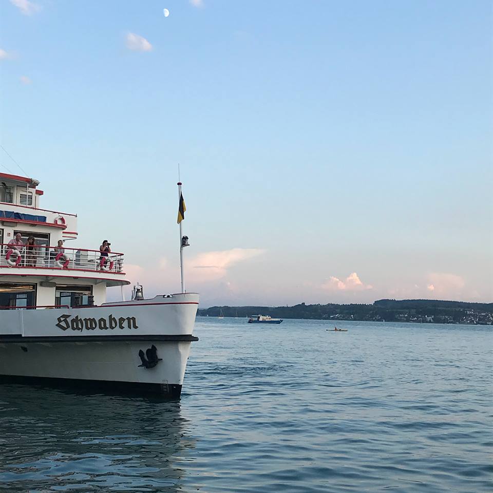 Von München aus fahren wir mit dem Zug nach Friedrichshafen. Da kann man dann theoretisch gleich losfahren. Da wir aber das Ende der Tour in der Schweiz bei einer Freundin verbringen wollen, setzen wir erst noch mit dem Schiff nach Konstanz über und starten dort.