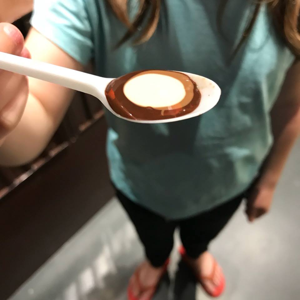 - Besuch in der Schokoladenfabrik. Da gibt es direkt von der Produktionsstrasse ein Förderband, mit dem werden die fertigen „Minörlis“ nach oben zu den Besuchern befördert. Zugriff unbegrenzt!