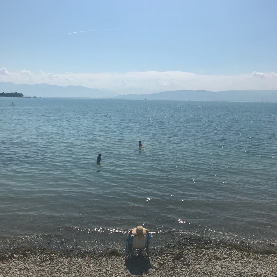 - Baden im See. Diesmal mit Luftmatratze. Das Wasser auf schweizer Seite ist deutlich wärmer, weil die Gemeinden so reich sind, dass sie den See mit riesigen Tauchsiedern (rechts im Bild) auf Badewannentemperatur erwärmen können.