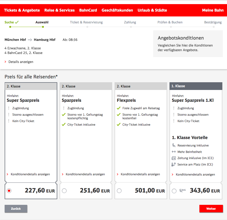 In der Übersicht sehen wir noch mal alle Daten, das Häkchen bei Fahrradtickets ist gesetzt. Das System scheint also noch zu wissen, dass wir als Suchkriterium in Schritt 1 „Fahrradmitnahme“ angehakt haben. Gut so. Klick auf „Weiter“