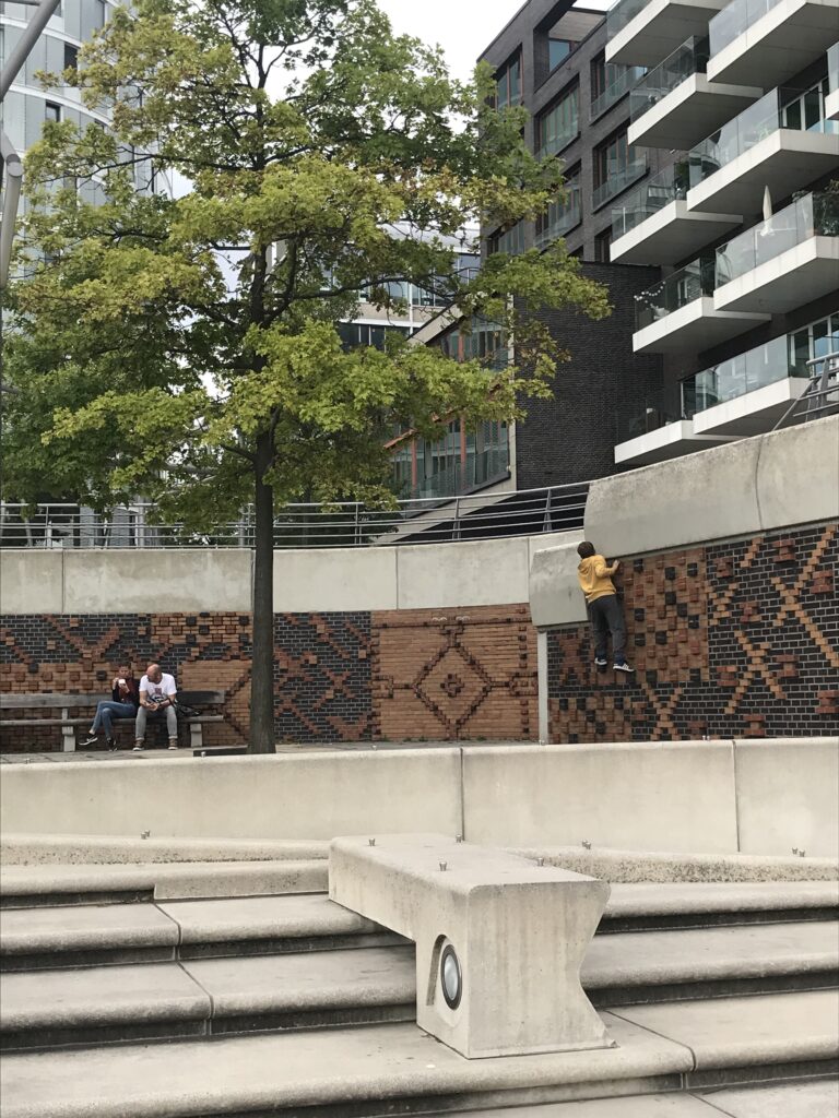 In Hamburg haben wir dann noch einen Nachmittag Zeit und fahren ein bisschen mit dem Fahrrad rum. Richtung Hafencity. Für Hamburger ist das wahrscheinlich ein übles Gentrifizierungsquartier mit überteuerten Preisen. Aber gentrifizierungstechnisch schockt einen Münchner eh nix mehr und die Kinder finden die ganze Uferpromenade parkourtechnisch sehr attraktiv.