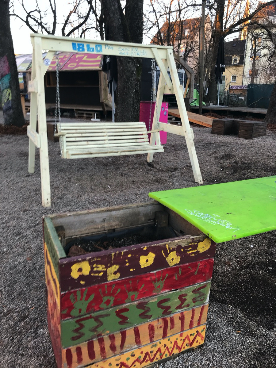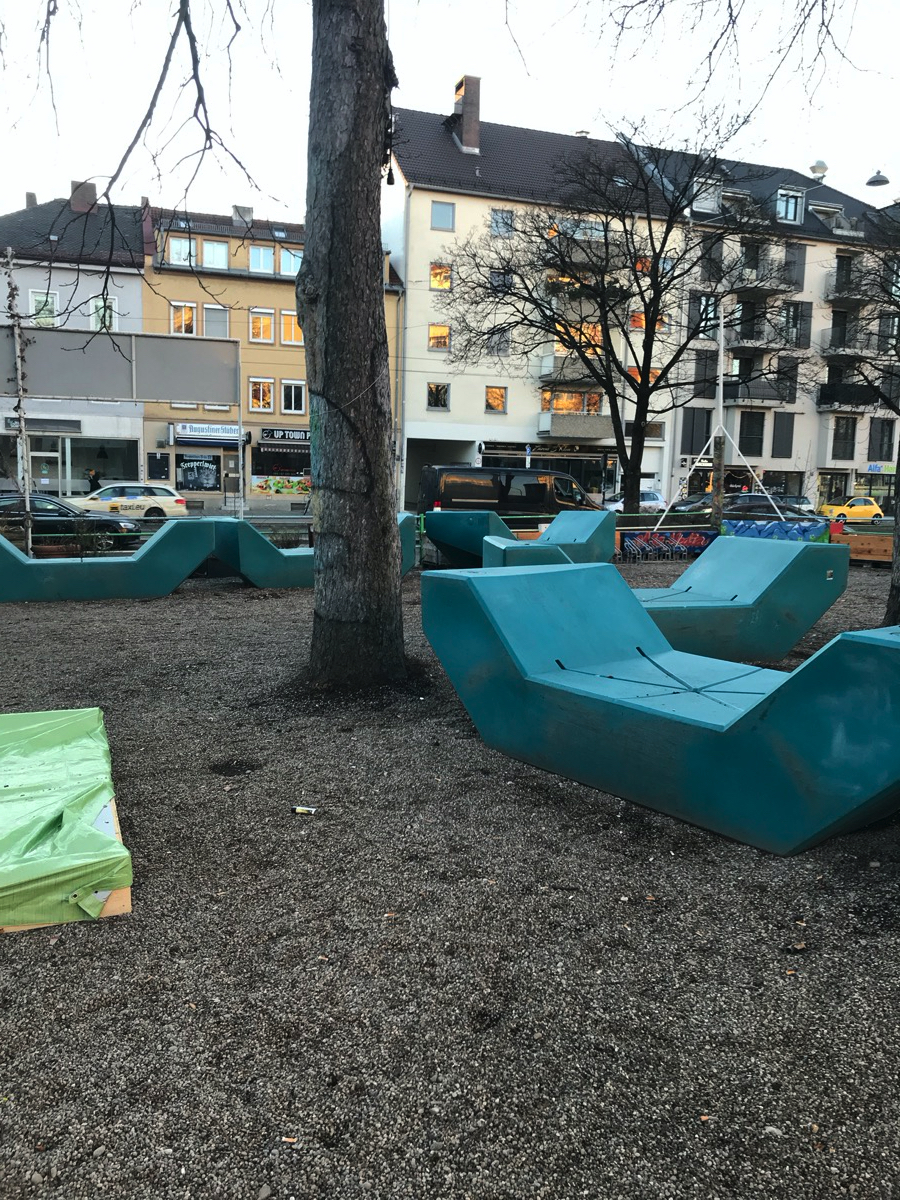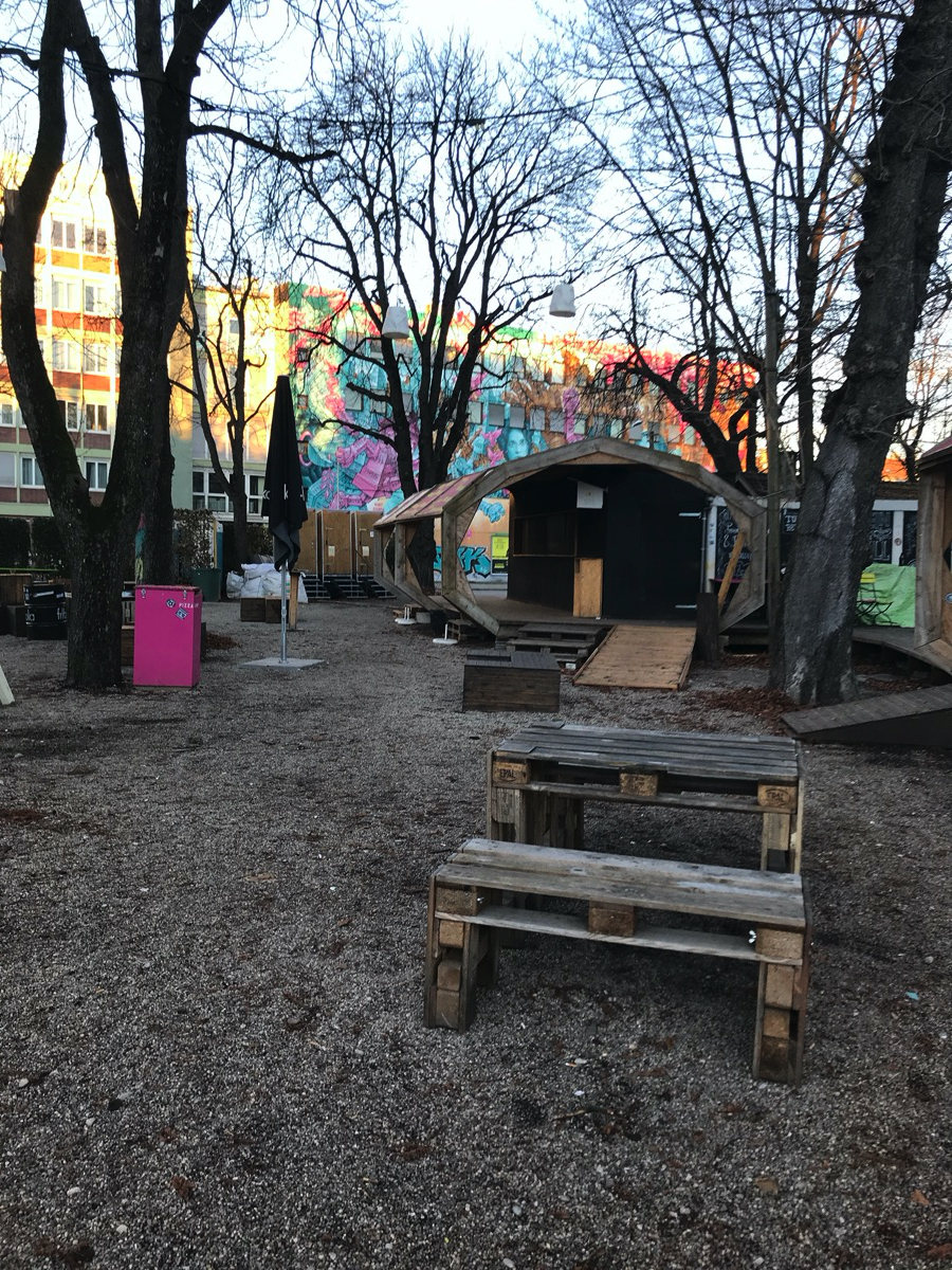 Auf dem Gelände war früher ein Gebrauchtwagenhändler. Vor ein paar Jahren wurde dort begonnen so einen bürgerbeteiligten Ort zu schaffen. Eingequetscht zwischen zwei großen Straßen ist ein schöner, urbaner Ort entstanden auf dem regelmäßig Veranstaltungen stattfinden, kleine Gärten entstehen und man ansonsten auch einfach nur mal abhängen kann. Da ich da nicht direkt wohne, weiß ich nicht genau, wie das angenommen wird, aber so wie der Platz sich entwickelt denke ich mal ganz gut.