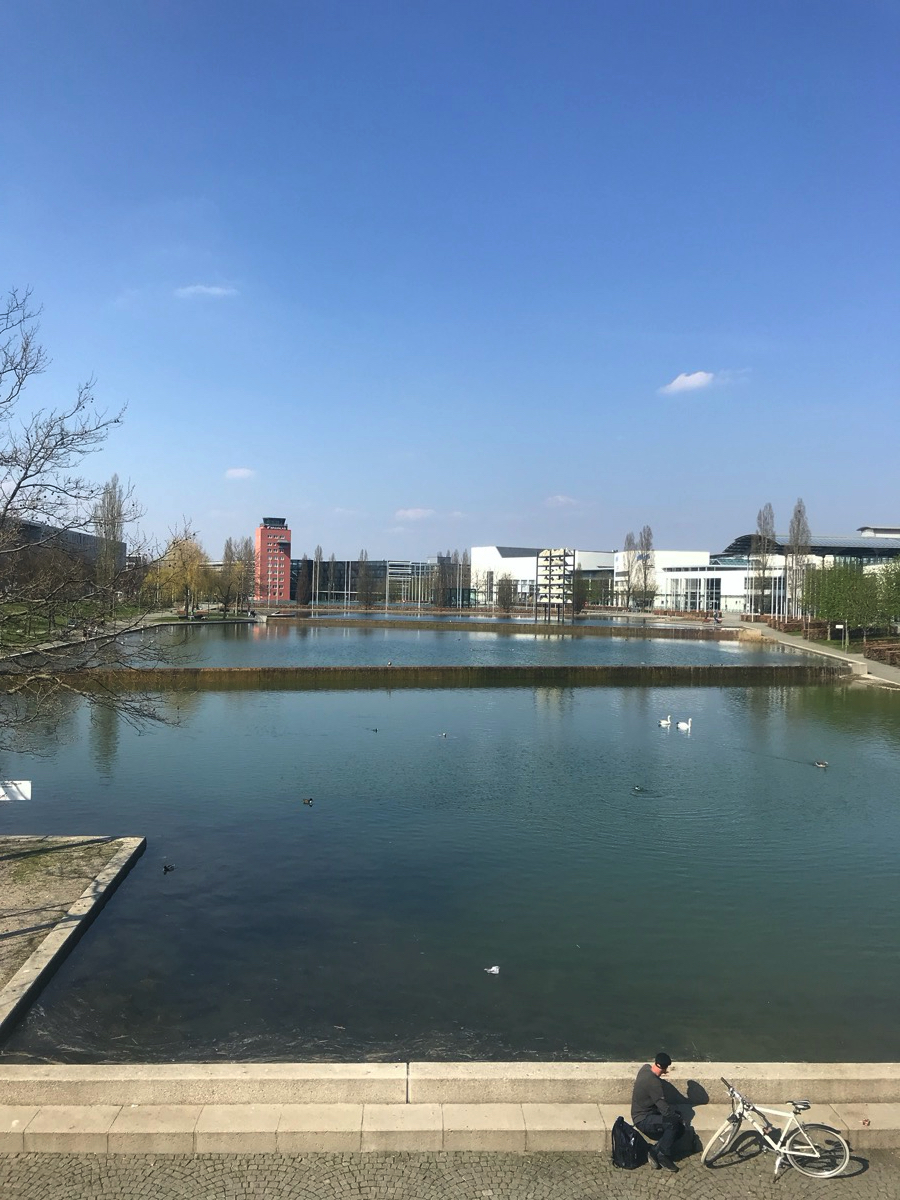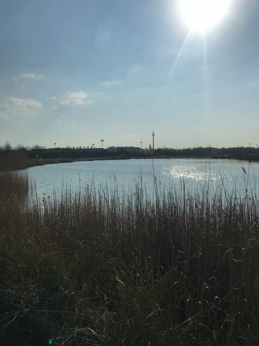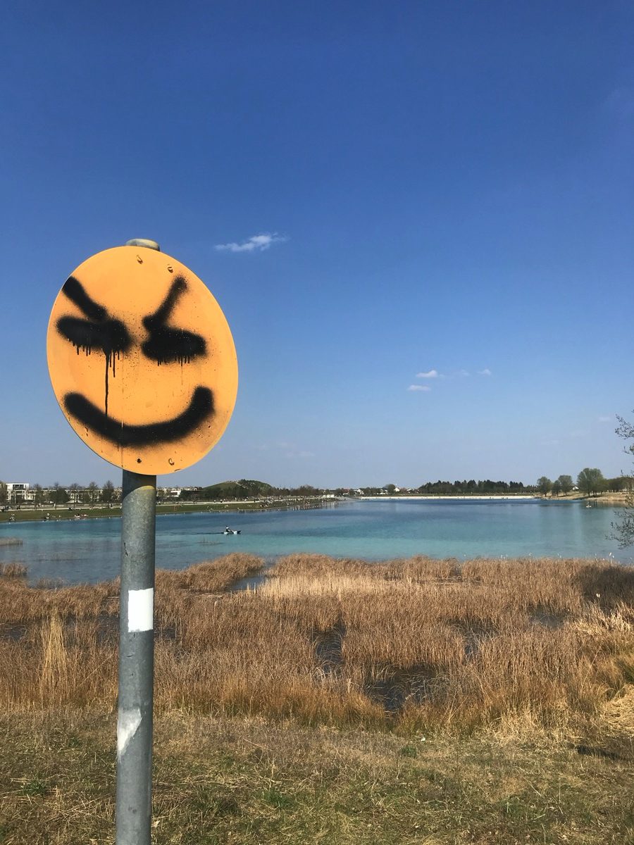 Zuerst kommt die Galopprennbahn, dann der kleine See vor der Messe (See 1). Die Straßen in der Messestadt sind leer, die zukünftige Bibliothek im Bau. Weiter geht’s zum Riemer See (See 2). In Ottendichl verkauft jemand Paletten (ohne Bier, 1€). Auf der alten Landebahn vom Fliegerhorst Neubiberg ist viel Platz zum Distanzieren. Vor dem Unterhachinger Stadion glitzert dann noch der namenlose See 3 in der Sonne. Auf der A8-Einflugschneise aus den Bergen heute eher wenig Rückreiseverkehr.