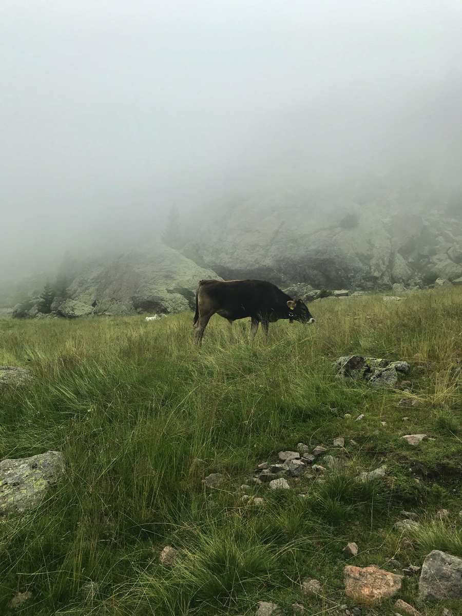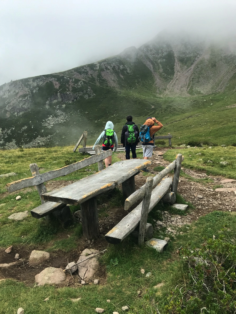 Es geht los am frühen Morgen am Gampenpass. Man kann die Runde von dort aus in beide Richtungen starten. Wir gehen direkt am Anfang nach rechts hoch. Es wird sofort steil, Trittsicherheit auf dem Wanderpfad ist angebracht. Je weiter wir hochkommen, desto nebliger und bewölkter wird es.