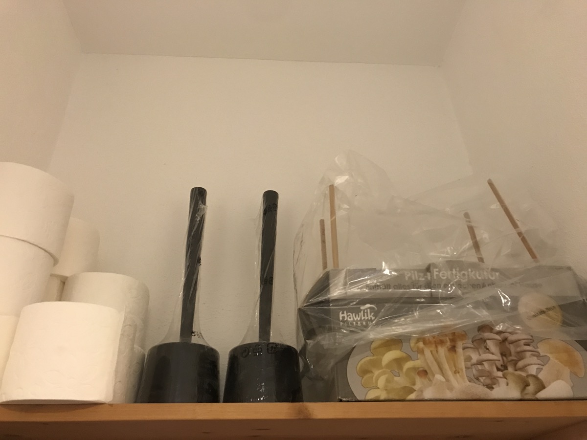 Die müssen jetzt, laut Videoanleitung, noch „ein paar Wochen“ bei 12-17 Grad stehen und wachsen. Weil wir grad die meisten Zimmer heizen, bekommen die Pilze jetzt einen Ehrenplatz im Klo. Direkt neben Ersatzbürsten und Toilettenpapier.