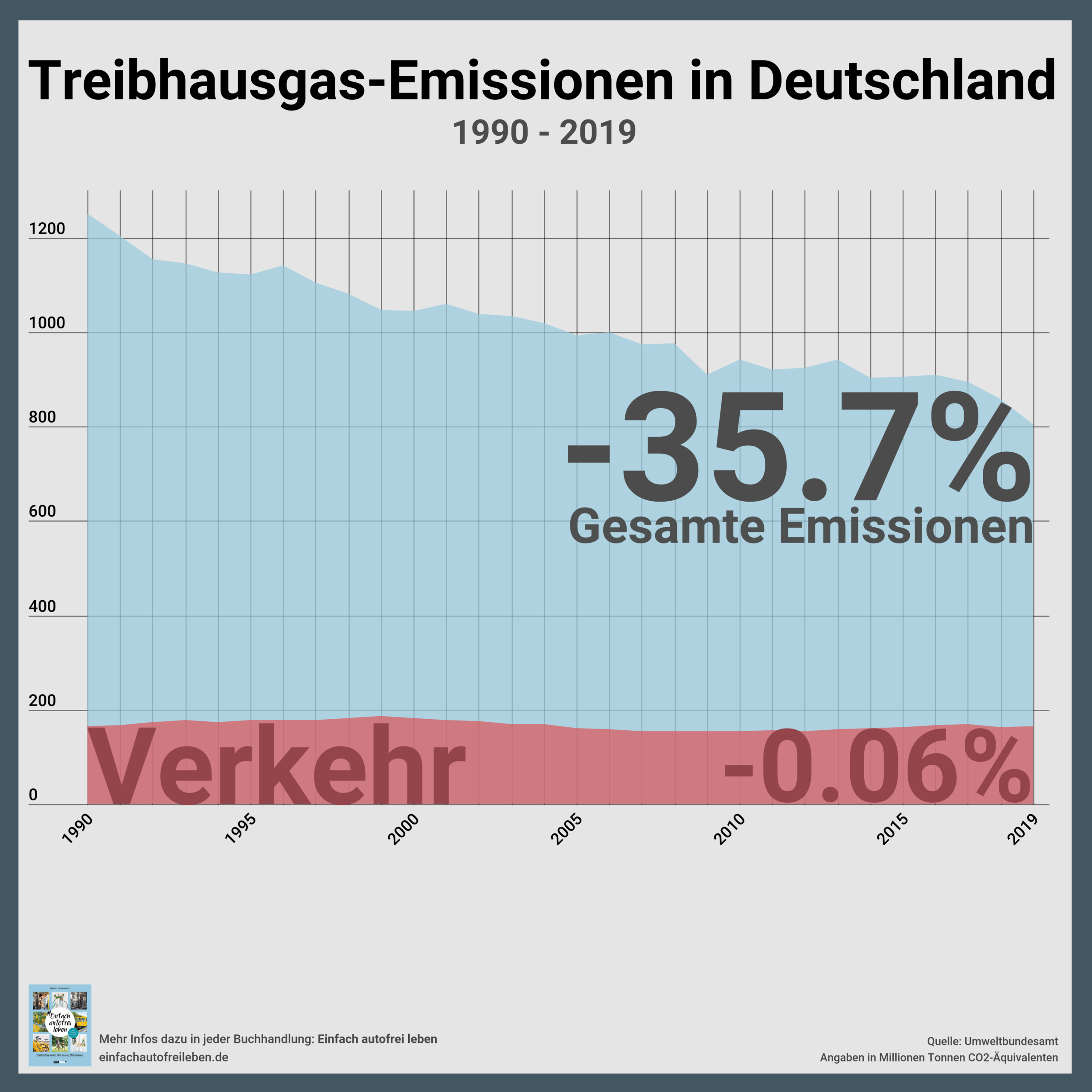 Die gesamten Treibhausgas-Emissionen der Bundesrepublik sind von 1990 bis 2019 um knapp 36% zurückgegangen. In einzelne Sektoren (z.B. Industrie oder Energie) wurden die Emissionen deutlich gesenkt. Im Verkehrssektor lag die Reduktion bis 2019 aber bei lediglich 0,06 %.
