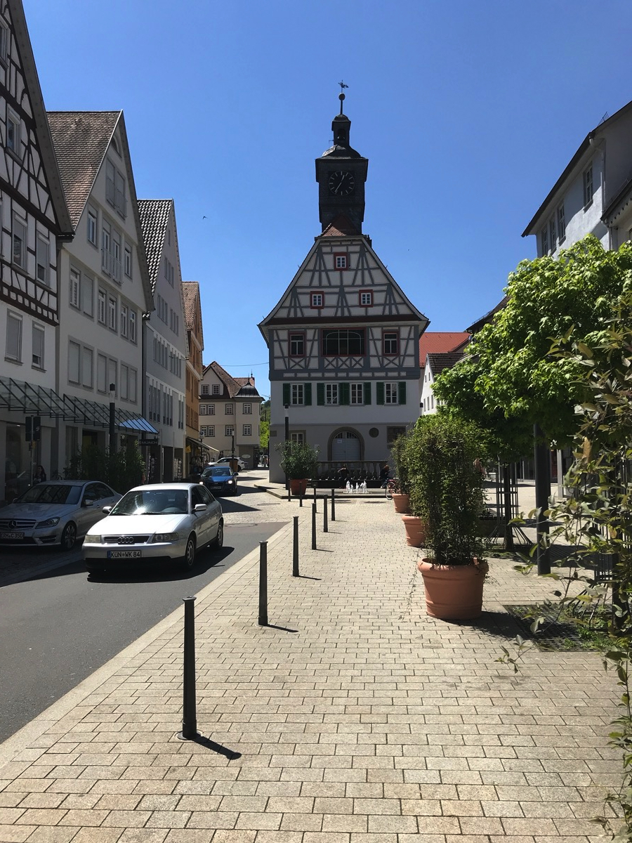 Das ist der Ortskern von Künzelsau. Künzelsau ist die kleine Kreisstadt, in der ich als Kind zur Schule gegangen bin. Der Ortskern ist ein Ortskern, wie es ihn in so vielen deutschen Kleinstädten gibt. Schöne, historische Häuschen, viel Einzelhandel, Gastronomie, Eisdiele. Und - natürlich -Parkplätze und Autos.