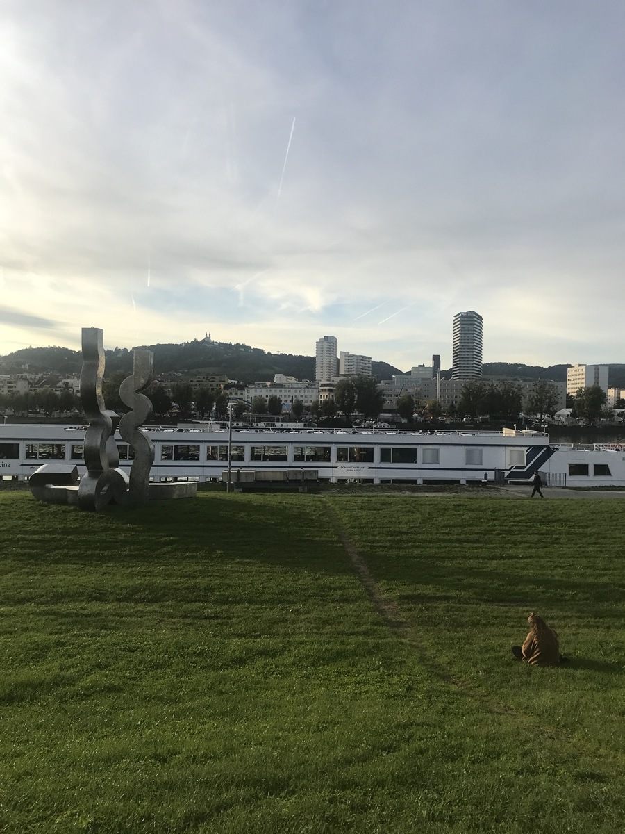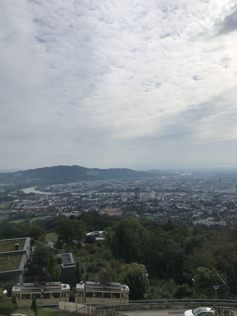 Der Linzer Hausberg ist der Pöstling. Man sieht ihn schon vom Hauptplatz aus. Das verleitet einige von uns, ihn in einem kurzen Spaziergang zu erreichen. Stellt sich dann doch als etwas längerer Weg mit Steigung und Schwitzen raus. 1,5 Stunden sollte man vom Zentrum aus mindestens einplanen. Wer es einfacher mag, steigt am Hauptplatz in die nostalgische Pöstlingbergtram ein. Die fährt bis hoch zur Burg. Auf dem Weg kommt man auch am betonlastigen Linzer Rathaus vorbei. Insgesamt eine interessante städtebauliche Mischung aus Altbau und Brutalismus.