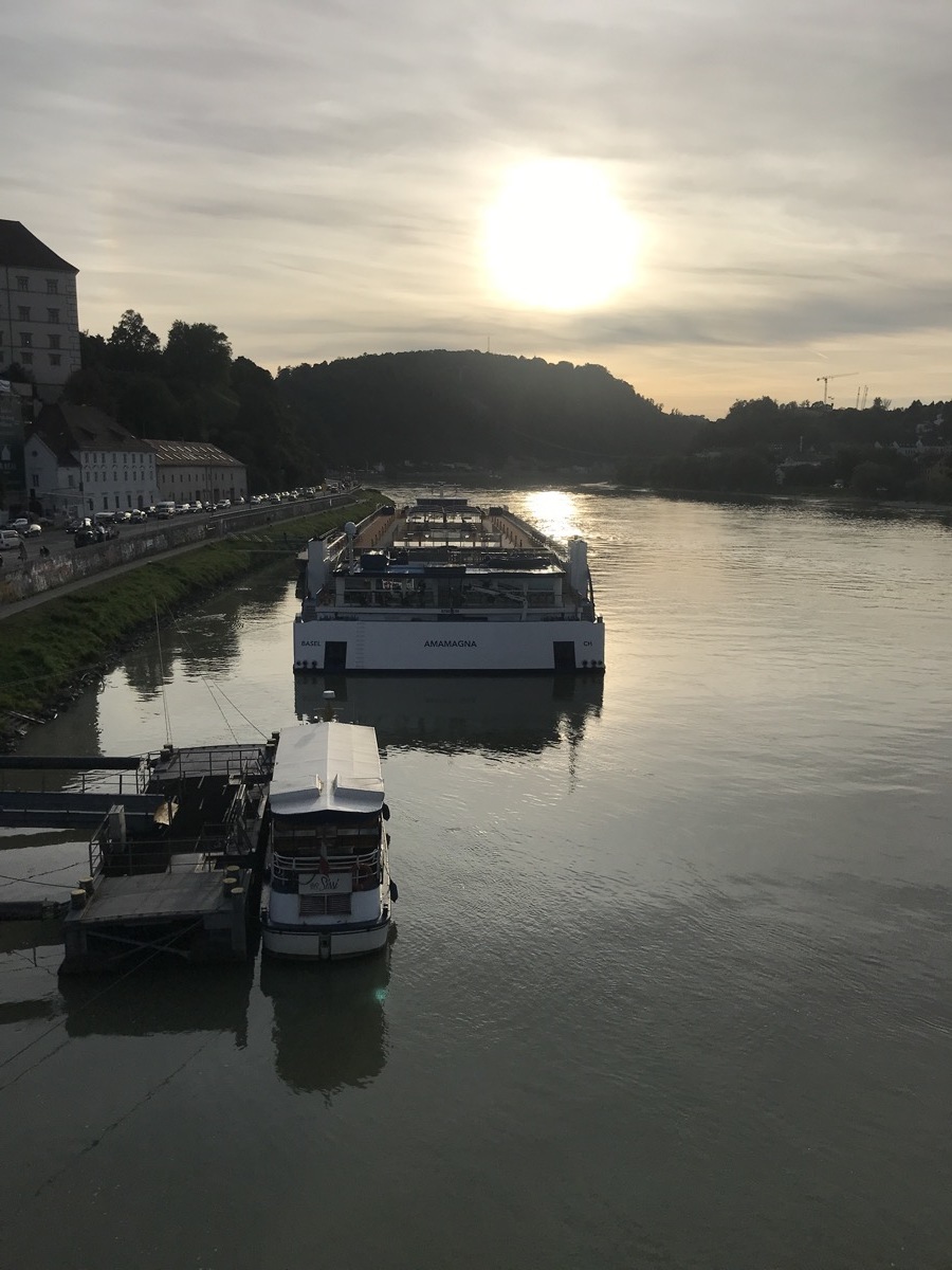Vom Platz aus machen wir gleich am Ankunftsabend noch einen kleinen Spaziergang entlang der Donau. Am nächsten Morgen ist Flohmarkt mit passendem Gemäldeangebot zur Weltlage.