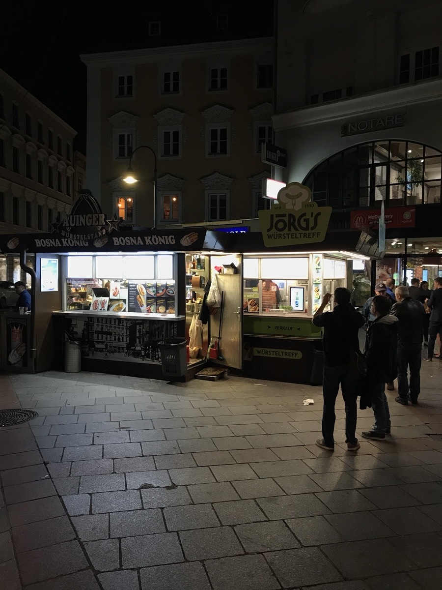 Zuerst mal muss lobend erwähnt werden: Österreich, wie lieben deine Würstlstände! Das war auch schon in Wien so. Wenn um Mitternacht der zweite Hunger kommt, der Würstlstand steht bereit. Es gibt Bier und Würste mit lustigen Namen - Klobasse oder Burenwurst - und immer wieder die Frage: warum stinkt München in der Beziehung so ab? Essen und Trinken waren wir beim Linzer Heurigen (zünftig, derb und günstig), in der stadtliebe (Cocktails und berlinernde Bedienung), Chelsea Pub (Bier), Sputnik (Bier und feine Musik auch noch nach Mitternacht) und im Klosterhof (solide touristisch).