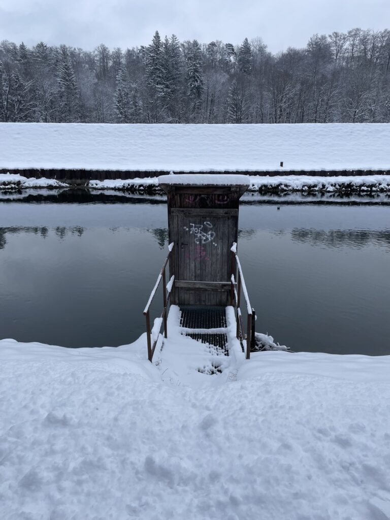 In Pullach geht es in der Ortsmitte über einen Fußweg direkt runter zur Isar und von da aus ist es dann recht einfach. Immer der Isar entlang flussabwärts. Es liegt Schnee, es ist schön. Schön ruhig. Wenn man immer weiter läuft stößt man nach knapp zwei Stunden unvermeidlich auf das neue Interimsquartier des in Sanierung befindlichen Gasteigs, das HP8. Das Kulturzentrum hat jeden Tag geöffnet. Es gibt Croissant und Kaffee, anschließend leihen wir in der dort einquartierten Stadtbibliothek noch zwei Reiseführer für den Sommerurlaub aus.
