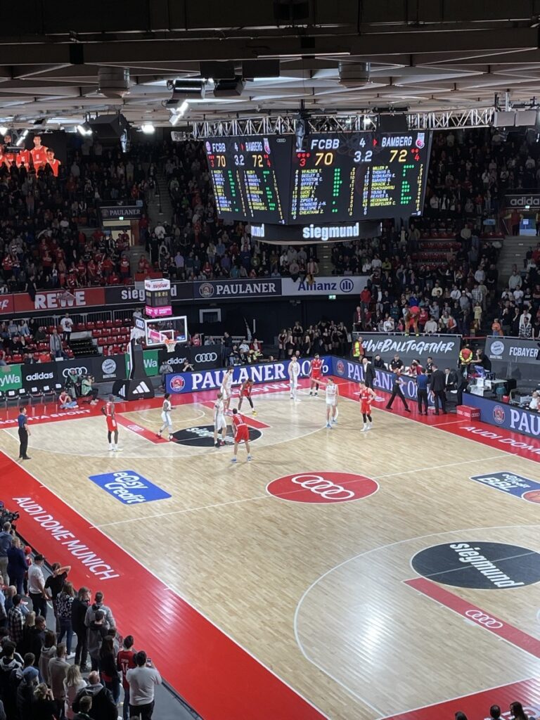 Am Abend Basketball. Gegeben wird FC Bayern gegen Brose Bamberg. Wobei man gegeben in der Basketball-Community glaub nicht sagt. Das war beim Theater. Aber ich weiß auch noch nicht so viel über Basketball. Die Kinder spielen das seit ein paar Jahren im Verein und erklären mir immer mal wieder was. Es ist also ganz praktisch, wenn man im Audi-Dome eine Tochter neben sich sitzen hat, die kurz erklären kann, wann es Frei- und wann es Einwurf gibt. Immerhin gings mir nicht wie einer Kollegin, die bei ihrem ersten Basketball-Spiel ihre Begleitung gefragt hat, warum die Fans sich selbst so abfeiern, weil sie die ganze Zeit "DIE FANS! DIE FANS!" rufen. Da gibt es nichts zur Verteidigung zu sagen. Basketball jedenfalls superspannend. Auf dem Bild sind noch 3.2 Sekunden zu spielen und Bamberg führt 72:70. 1.4 Sekunden später führt der FC Bayern 73:72 und gewinnt. Fußball go homeschnarchzzzzzz....