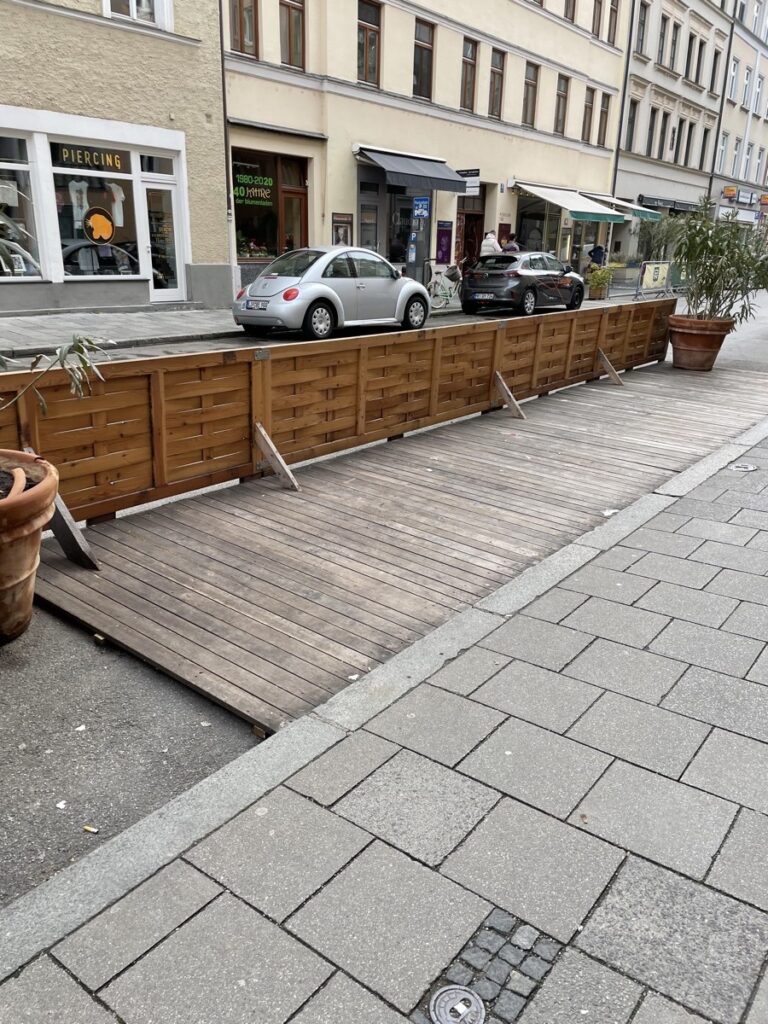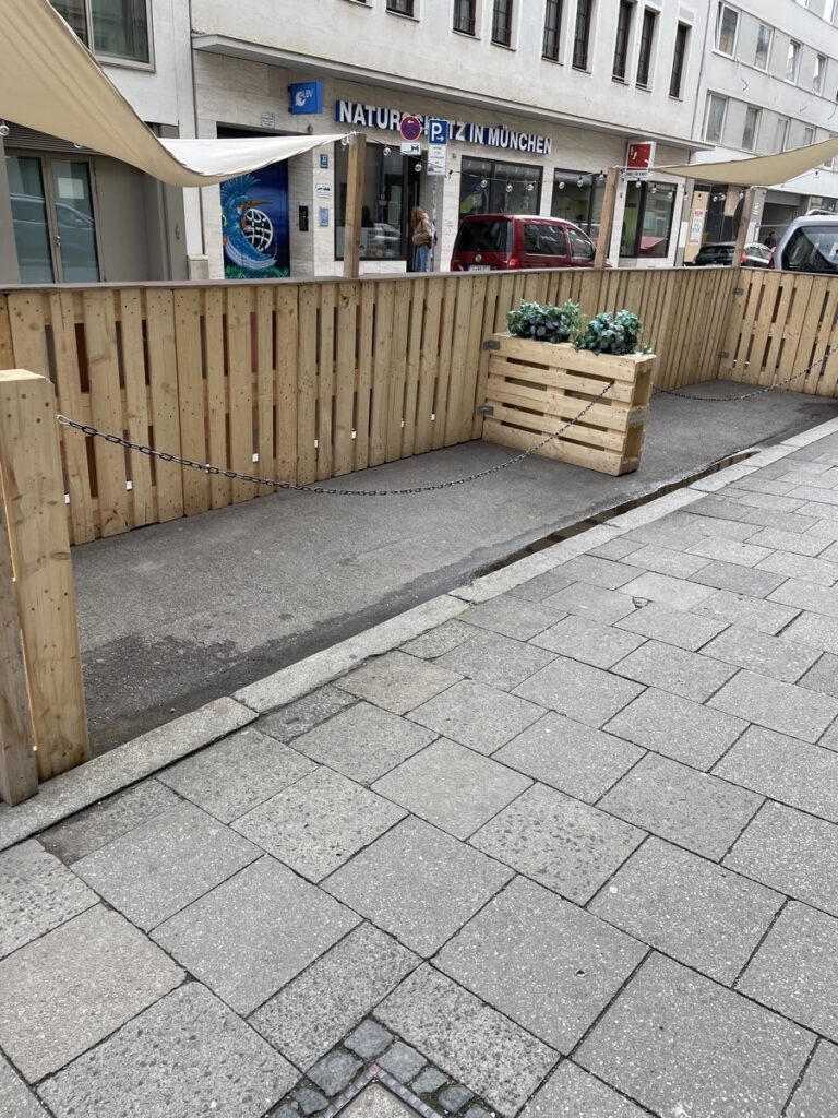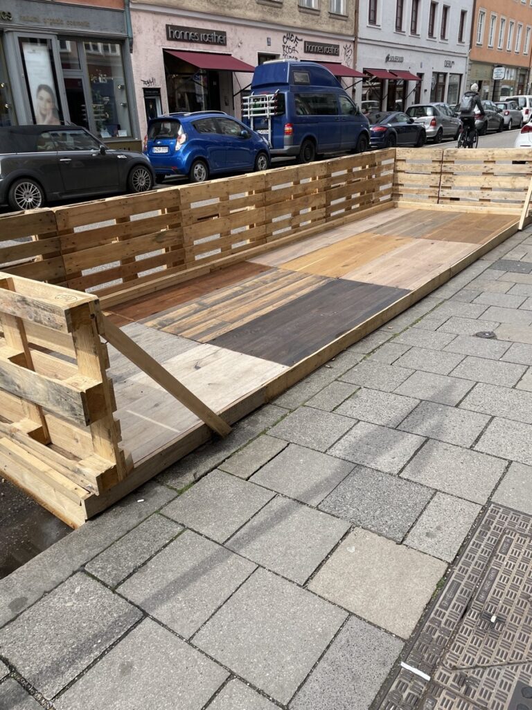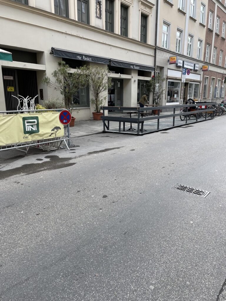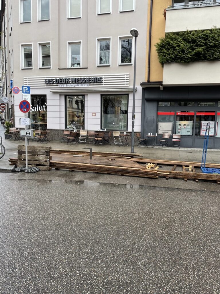 Jedenfalls: Ein schneller Streifzug durch die angrenzenden Stadtviertel zeigt zahlreiche Schanigärten im Aufbau. Da wo sonst 2-3 Autos meistens ziemlich unausgelastet rumstehen, kann man demnächst lauschig sitzen und anstoßen.