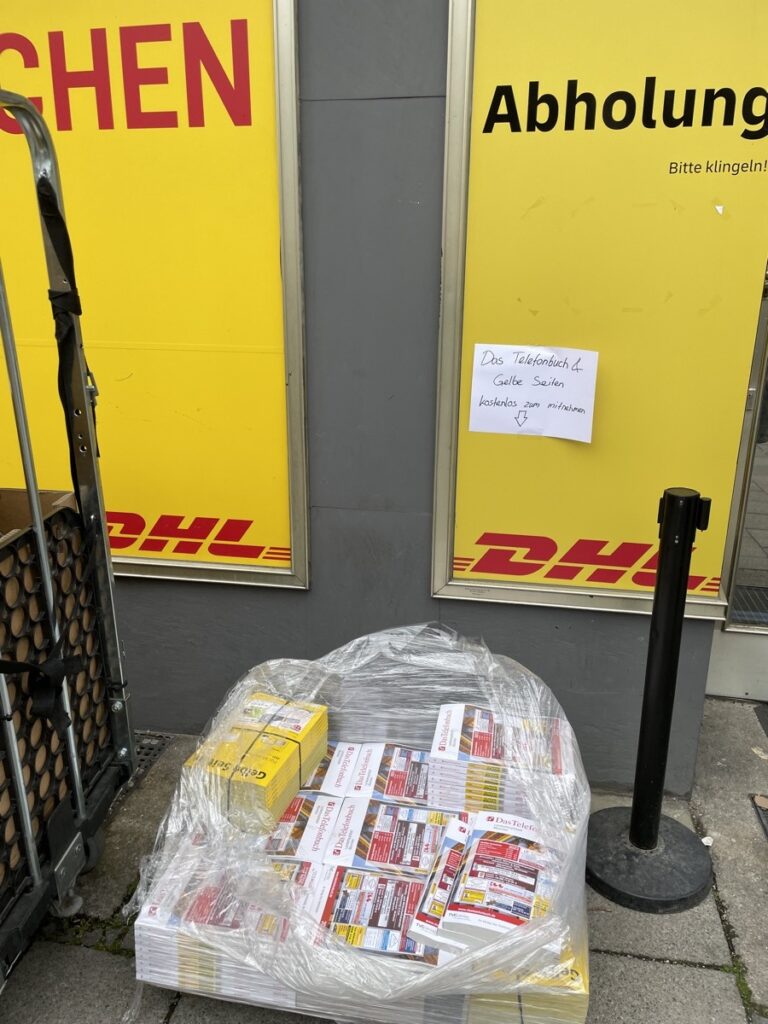 Es geht weiter zum Paketshop. Das neue Telefonbuch liegt aus, ich greife zu. Aus zwei Gründen.