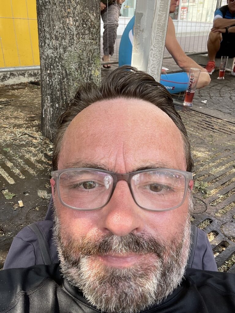 In dem Moment, als ich das Selfie abschicke, höre ich von hinten eine Stimme meinen Namen rufen. Die Stimme kommt mir irgendwie bekannt vor. Das liegt daran, dass es meine Lieblingsbibliothekarin ist, die überraschend und unangekündigt zum Zieleinlauf nach Erding rausgefahren ist. Sie ist die schwarz-weiße Hose hinter dem Absperrzaun. Auf ihrem Handy kommt grad mein Selfie an.