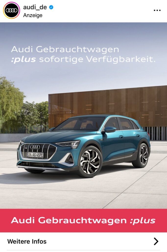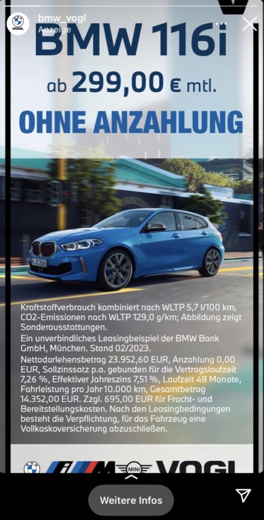 Ich scrolle nach meinem Blogpost noch ein bisschen weiter Insta und werde innerhalb von 15 Minuten zugeballert mit: Autowerbung. 18 Anzeigen.