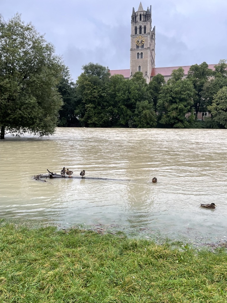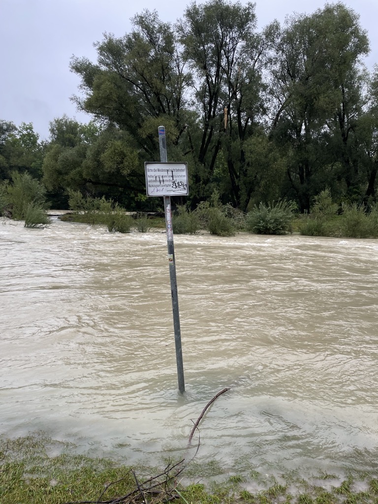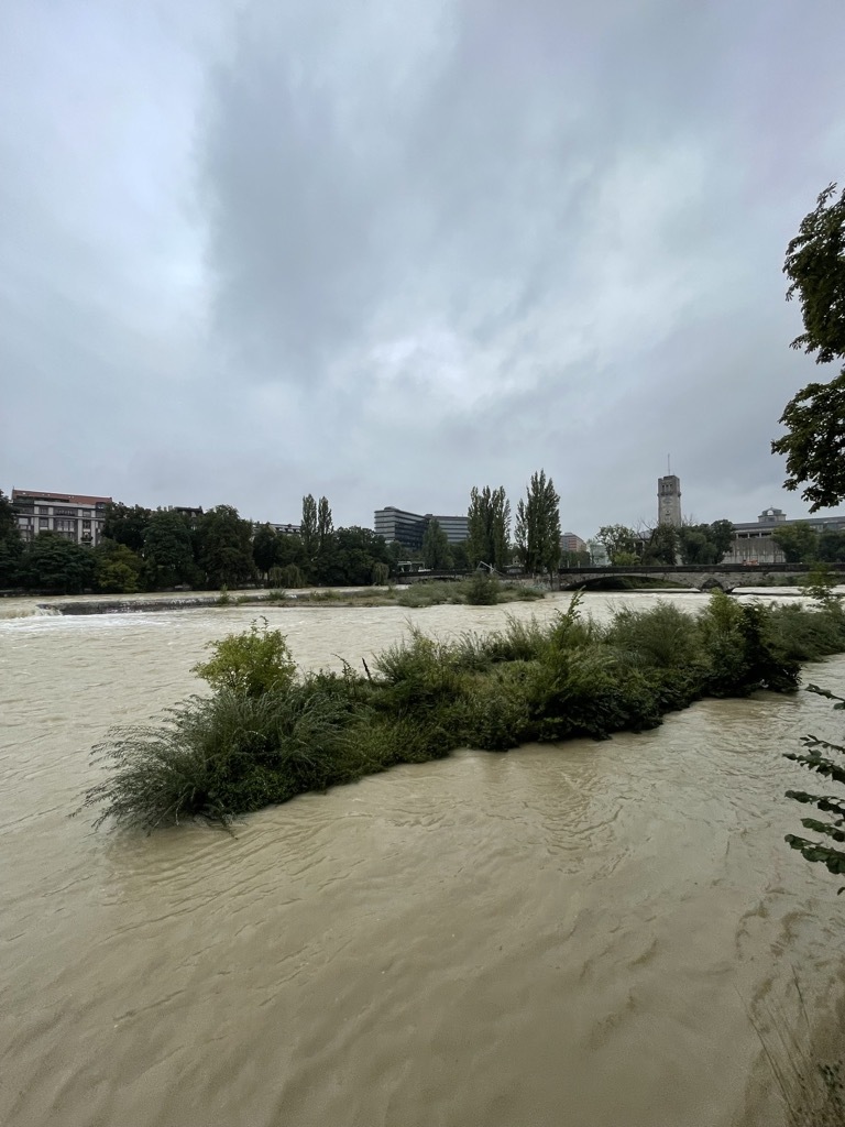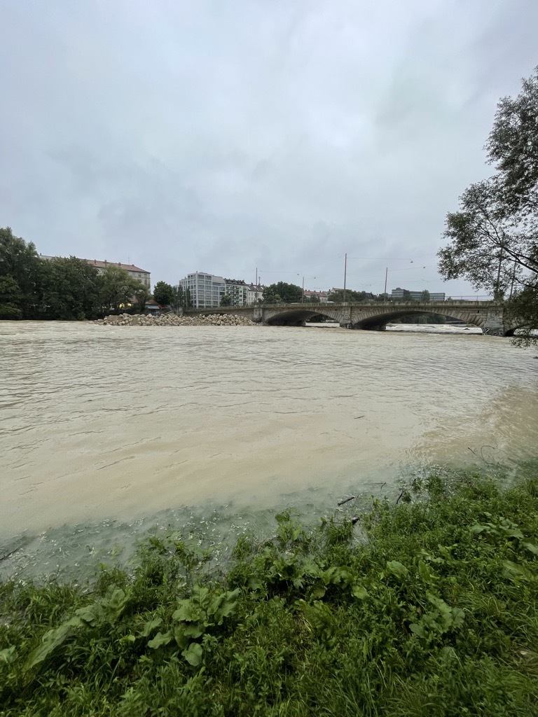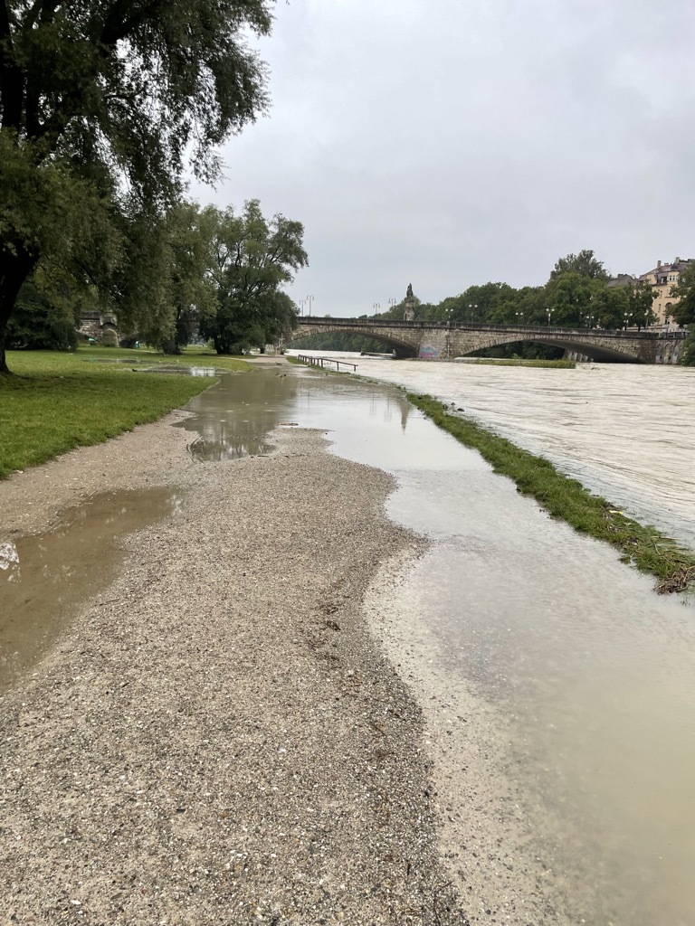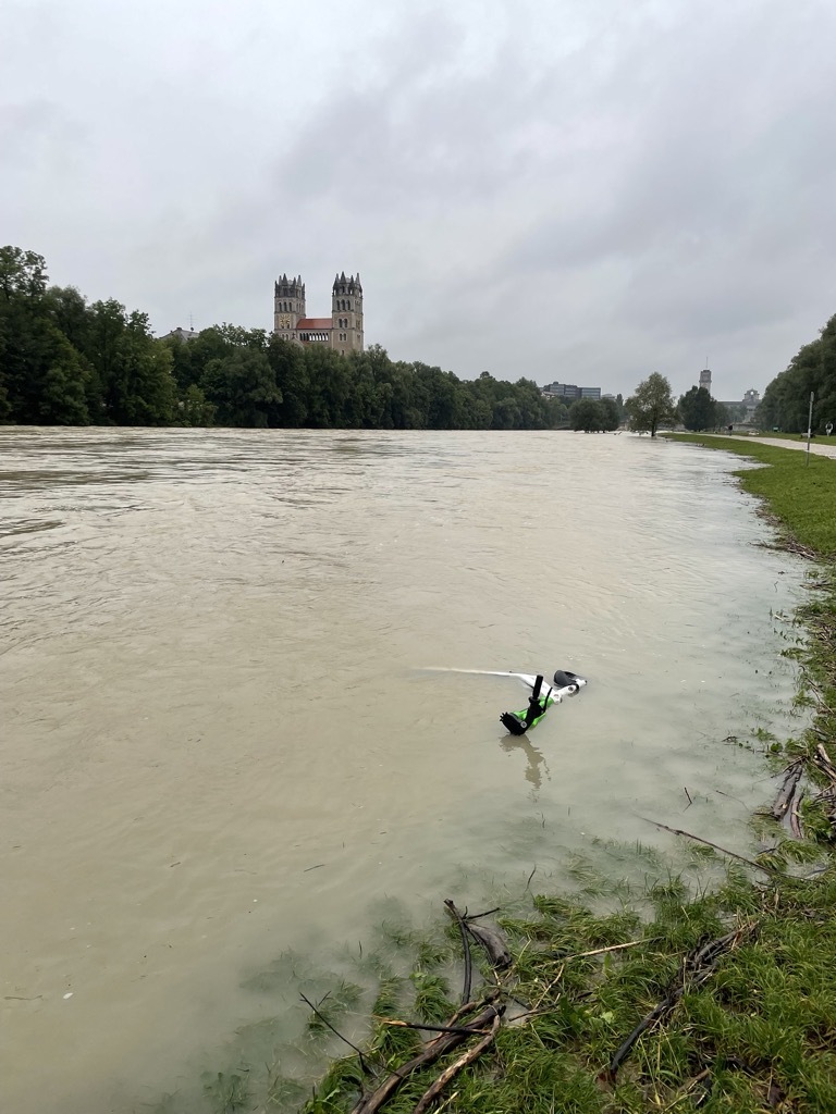 Beim Morgenlauf komme ich meiner Hochwasserchronistenpflicht nach. Es ist Meldestufe 2 und diesmal scheint es etwas höher als im Mai. Ein kurzes Teilstück am Ufer kurz vor der Wittelsbacher Brücke ist nicht mehr bejoggbar, ein Scooter sieht ziemlich mitgenommen aus.
