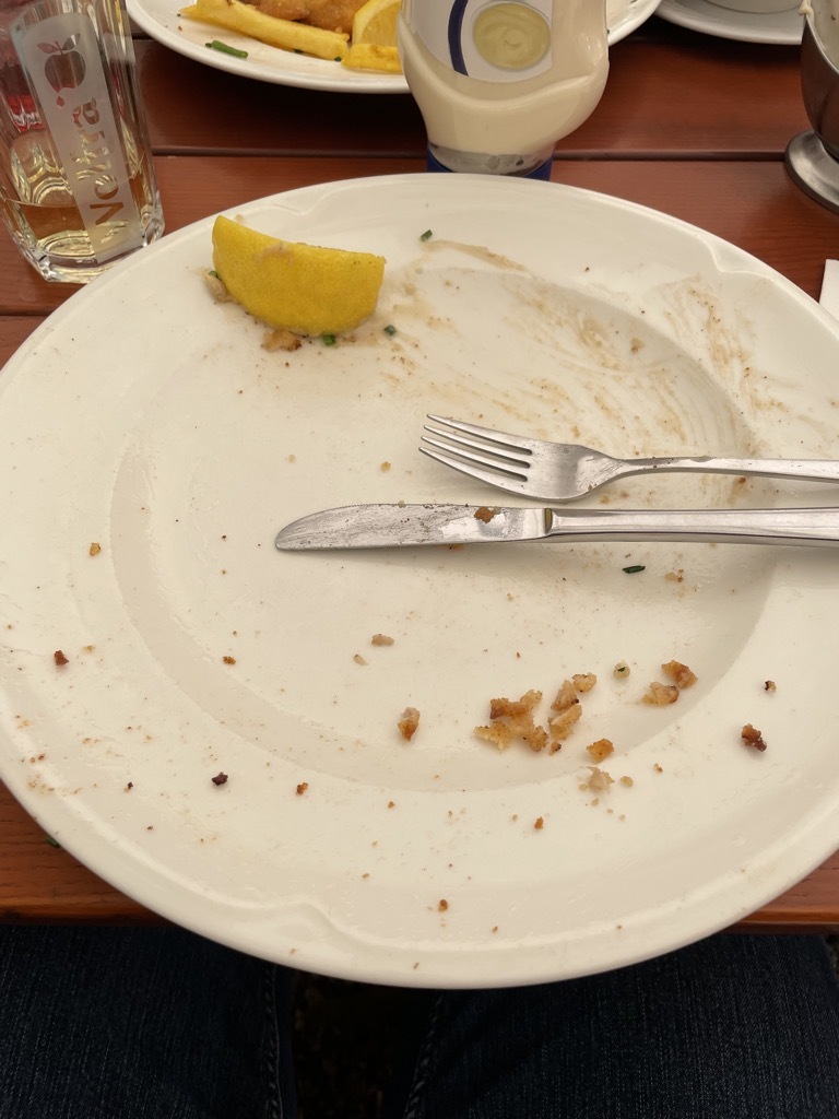 Mittagessen in Andys Krabblergarten. Falls ihr mal in München in der Nähe des Sendlinger Tors Hunger bekommt: Andy hat Schnitzel für euch. Der Laden sieht von außen nicht so ganz doll einladend aus, aber im Hinterhof schlummert ein Kleinod an Biergarten. Die Schnitzel sind legendär riesig. Ich fotografiere den Teller und fühle mich dabei ein bisschen schmutzig, weil es sich nach Markus-Söder-Wahlkampf anfühlt. Dann poste ich das Bild in den Familienchat. Ich poste oft Bilder in den Familienchat, normalerweise ohne irgendeine Reaktion hervorzurufen. Nach dem Schnitzelbild schreibt der Sohn nach 10 Sekunden kurz und knapp zurück: "Wo!?"