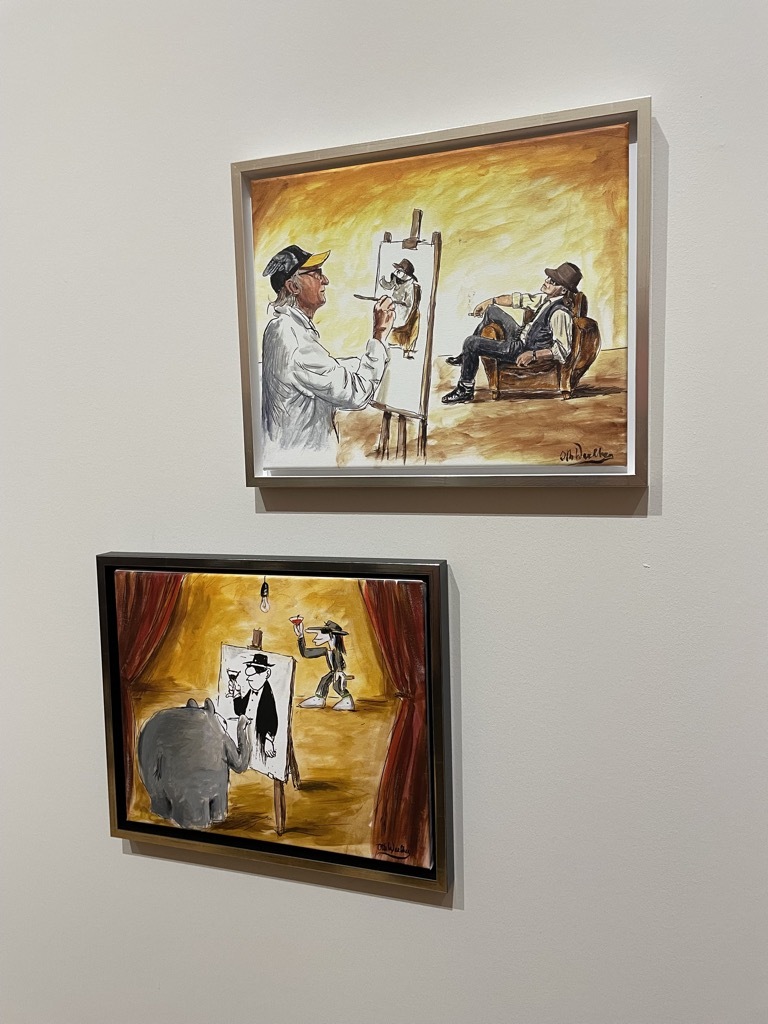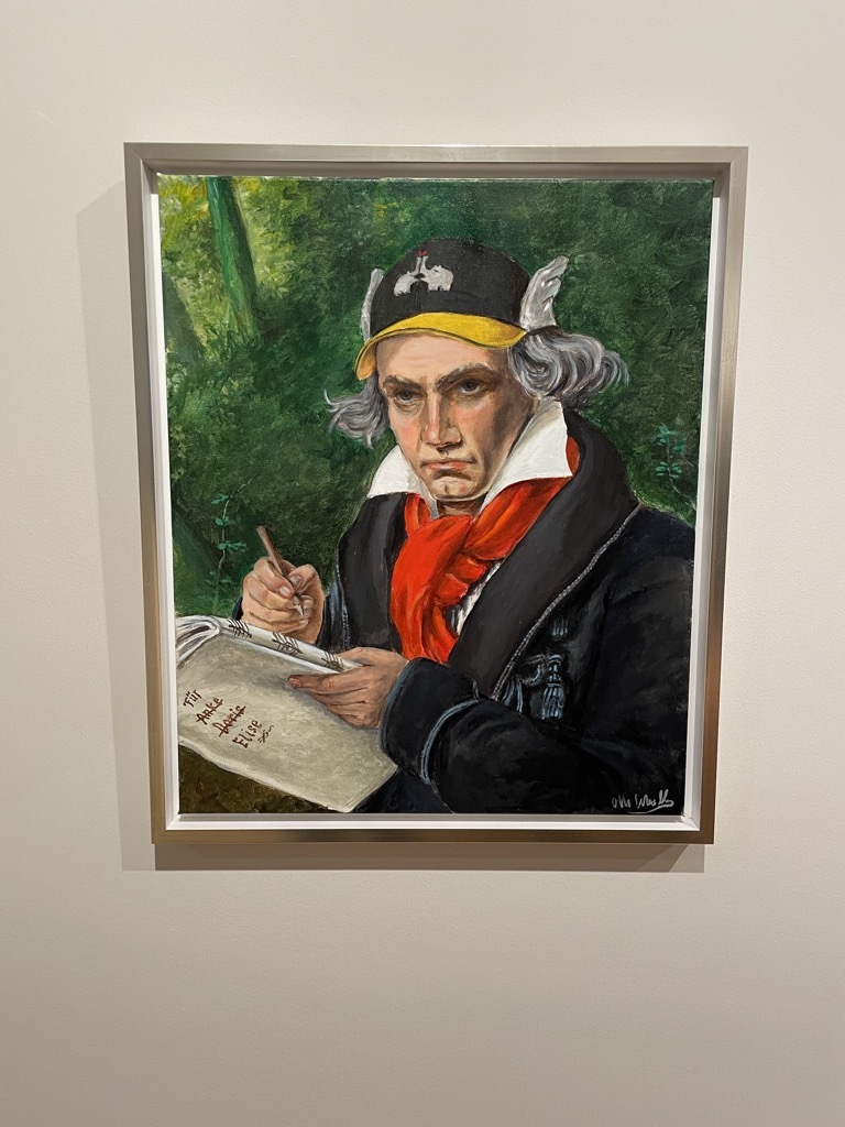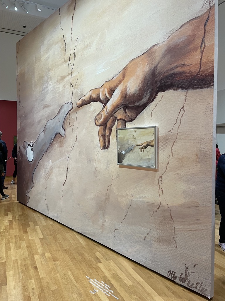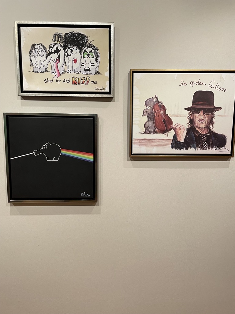 In der Ausstellung gibt es auch ein paar kleinere Bereiche, wo alte Sketche laufen und auf Ottos Curriculum vitae zurückgeblickt wird, aber der größte Teil besteht aus seinen neueren Gemälden, die er vor allem in den letzten 10 bis 15 Jahren gemalt hat. Das Prinzip ist fast immer gleich: in ein bekanntes Werk der Kunstgeschichte ein paar Ottifanten reinmalen. Irgendwie aber so originell und auch wirklich gekonnt gemacht, dass es mir überhaupt nicht langweilig wird. Schön.