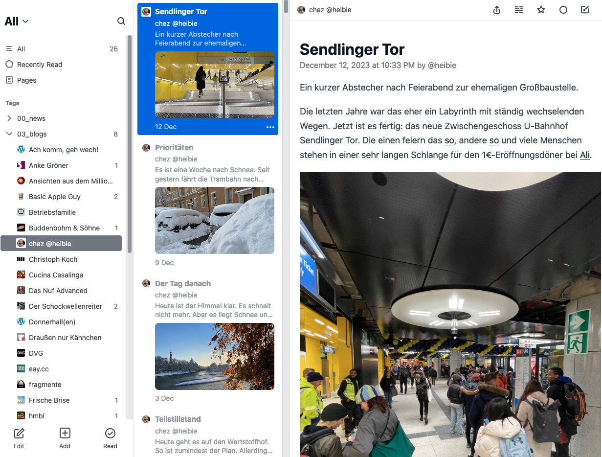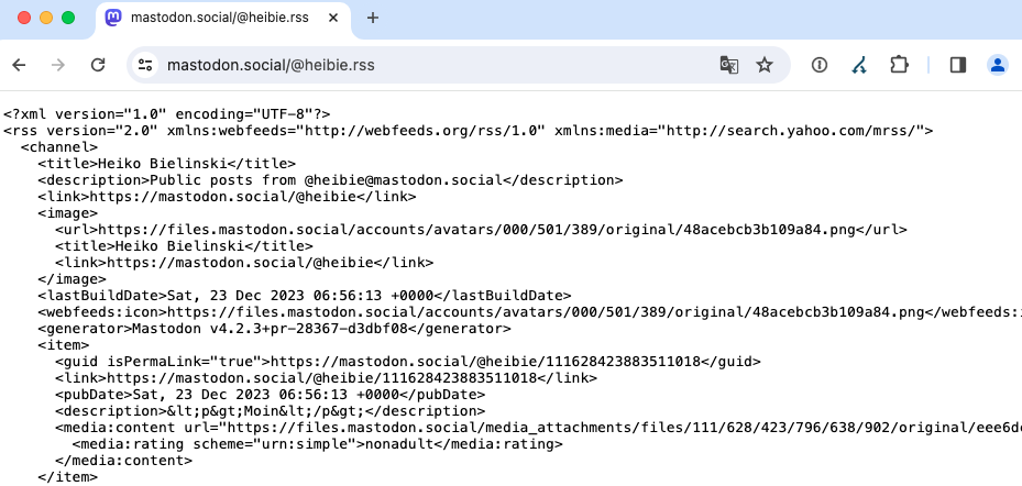 Und auch bei sozialen Netzwerken ist RSS eine Möglichkeit, auf dem Laufenden zu bleiben. Also zumindest bei sozialen Netzwerken aus dem Fediverse. Meine Mastodon-Trööts kann man unter https://mastodon.social/@heibie.rss abonnieren. Einfach hinter jeden beliebigen Nutzernamen ein .rss setzen. Damit kann man die eigene Mastodon Timeline lesen, ohne jemals die App aufzurufen. Werbegetriebene Netzwerke haben da eher keine Lust drauf und bieten das momentan nicht an. Sie leben von der Interaktion, die direkt auf den Plattformen stattfindet.