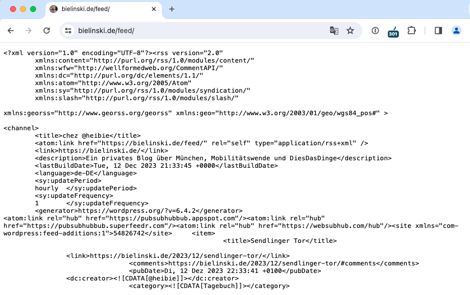 RSS ist ein standardisiertes Format, mit dem im Prinzip jedes Webangebot, egal ob redaktioneller Dienst, privates Blog oder Social-Media-Netzwerk, Posts und Artikel maschinenlesbar und nach Veröffentlichungsdatum sortiert zur Verfügung stellen kann. Maschinenlesbar bedeutet dann, dass der RSS-Feed meines Blogs erst mal so kauderwelschig aussieht.