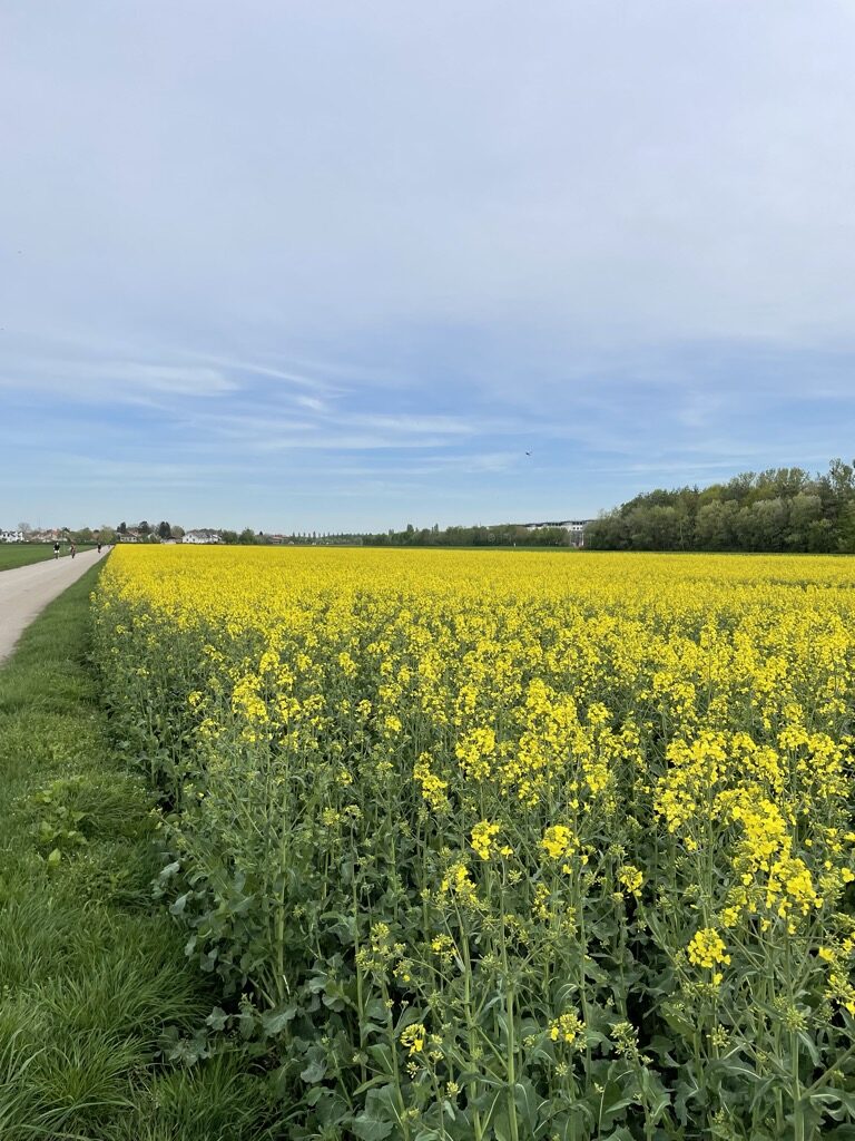 Eine kleine Radrunde. Ich schau mir mal den Münchner Nordosten an. Zwischen Bogenhausen und Riem, direkt vor den Toren der Stadt ist es noch überraschend ländlich und hinter der Wiese winkt die Stadt mit einem Hochhaus.