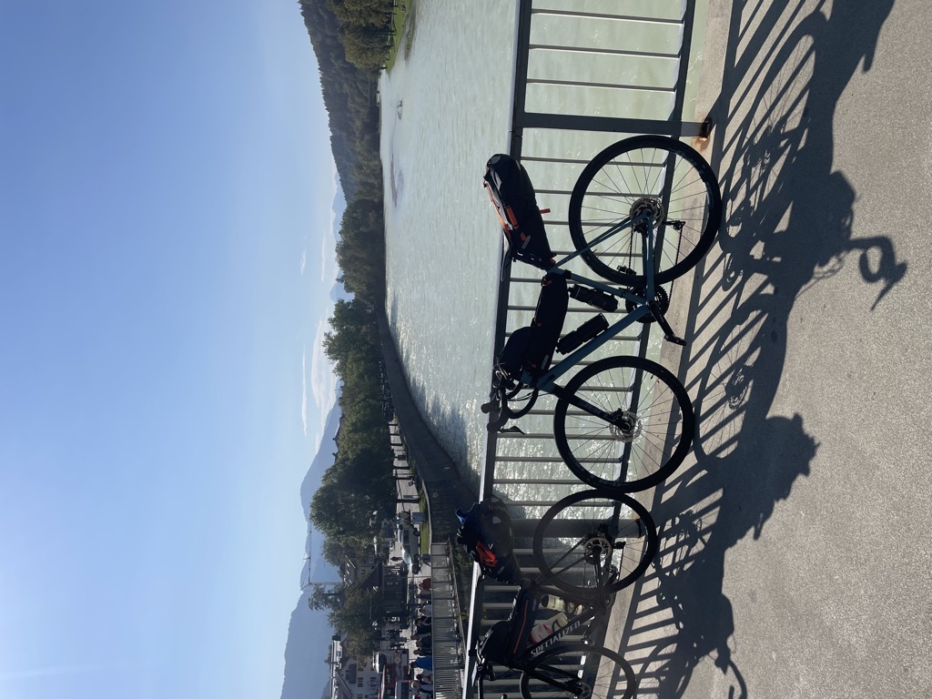 Freund Lars weiß aber zu berichten, dass die Passstraße steiler und vor allem reine Autostraße ist. Deshalb Variante 2.1: Über Bad Tölz und Lengries hoch zum Sylvensteinspeicher und vorn dort aus zum Achensee. Das erweist sich als gute Idee. Die längste Tagestour, die ich bisher gemacht habe, war die Bodenseeumrundung mit 130 Kilometern und keinerlei Steigung. Die 150 Kilometer und zusätzlich fast 1000 Höhenmeter flößen mir vorab ein bisschen Respekt ein. Aber die Steigung von Lenggries zum Sylvensteinspeicher ist wirklich sehr moderat und eher lang gezogen. Außerdem fast alles auf eigenem Radweg. Das bekommen wir gut hin. Direkt nach dem Achensee geht es dann runter ins Inntal. Und die Abfahrt ist tatsächlich genau so, wie sie auf dem Komoot-Höhenprofil aussieht. Die Bremsen rauchen. Die letzten 40 Kilometer durchs Inntal ziehen sich dann etwas kaugummihaft. Nach 10 Stunden erreichen wir Innsbruck.