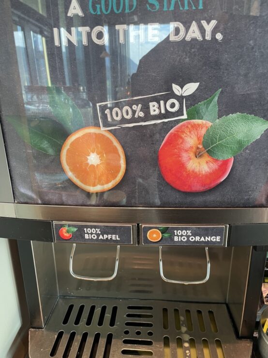 Wir checken im MotelOne ein. Ich mag MotelOnes. Man weiß, was man bekommt zu einem okayen Preis. Das Innsbruck-MotelOne liegt direkt am Bahnhof. Und mit direkt meine ich, dass mein Zimmer eigentlich direkt ans erste Bahngleis angrenzt. Trotzdem ist es überraschend ruhig. Außerdem überzeugt das Hotel mit eigenen abschließbaren Fahrradabstellplätzen in der Tiefgarage und gleich danach mit der fantastischen Aussicht von der Dachterrasse. Dort nimmt man auch das Frühstück ein. Die Beschriftung am Saftautomaten verwirrt mich.