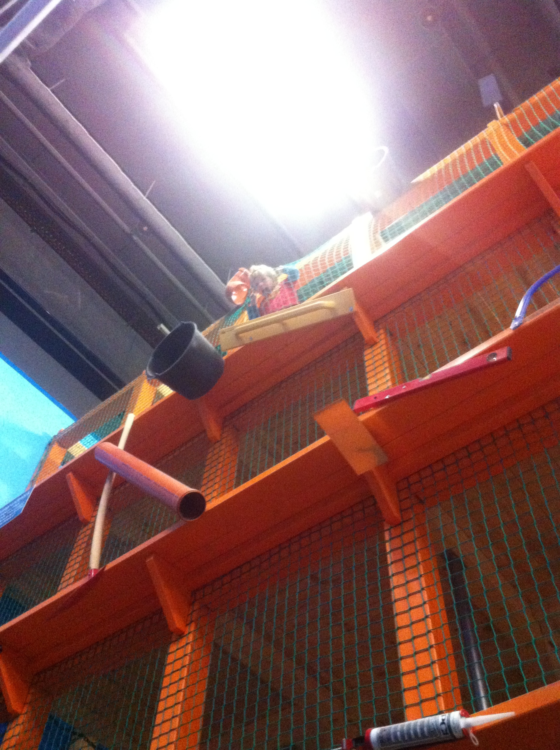Cool bleiben! Ein Kind (nicht meins) testet das Netz im 4. Stock des Kletterbaugerüsts.