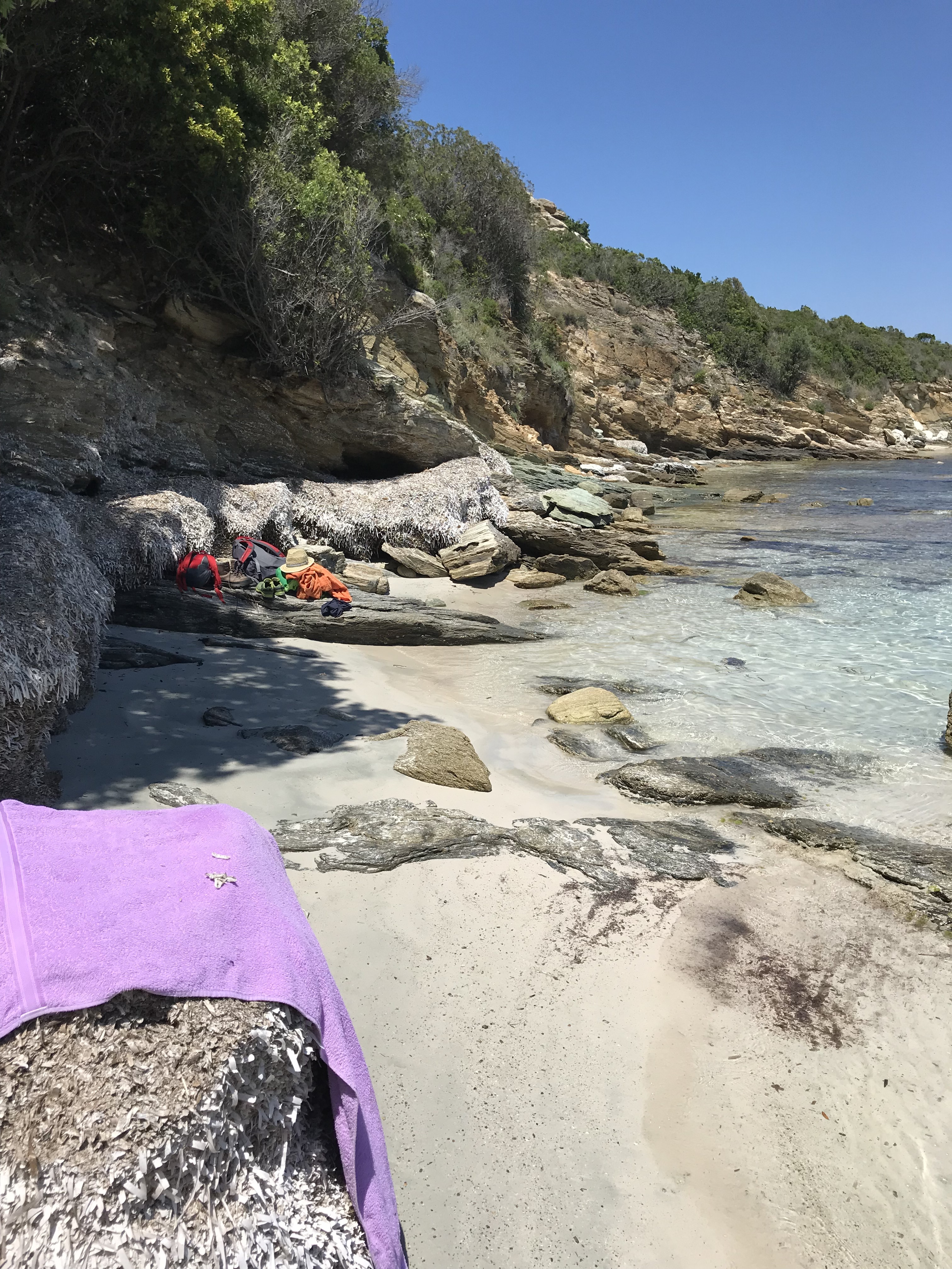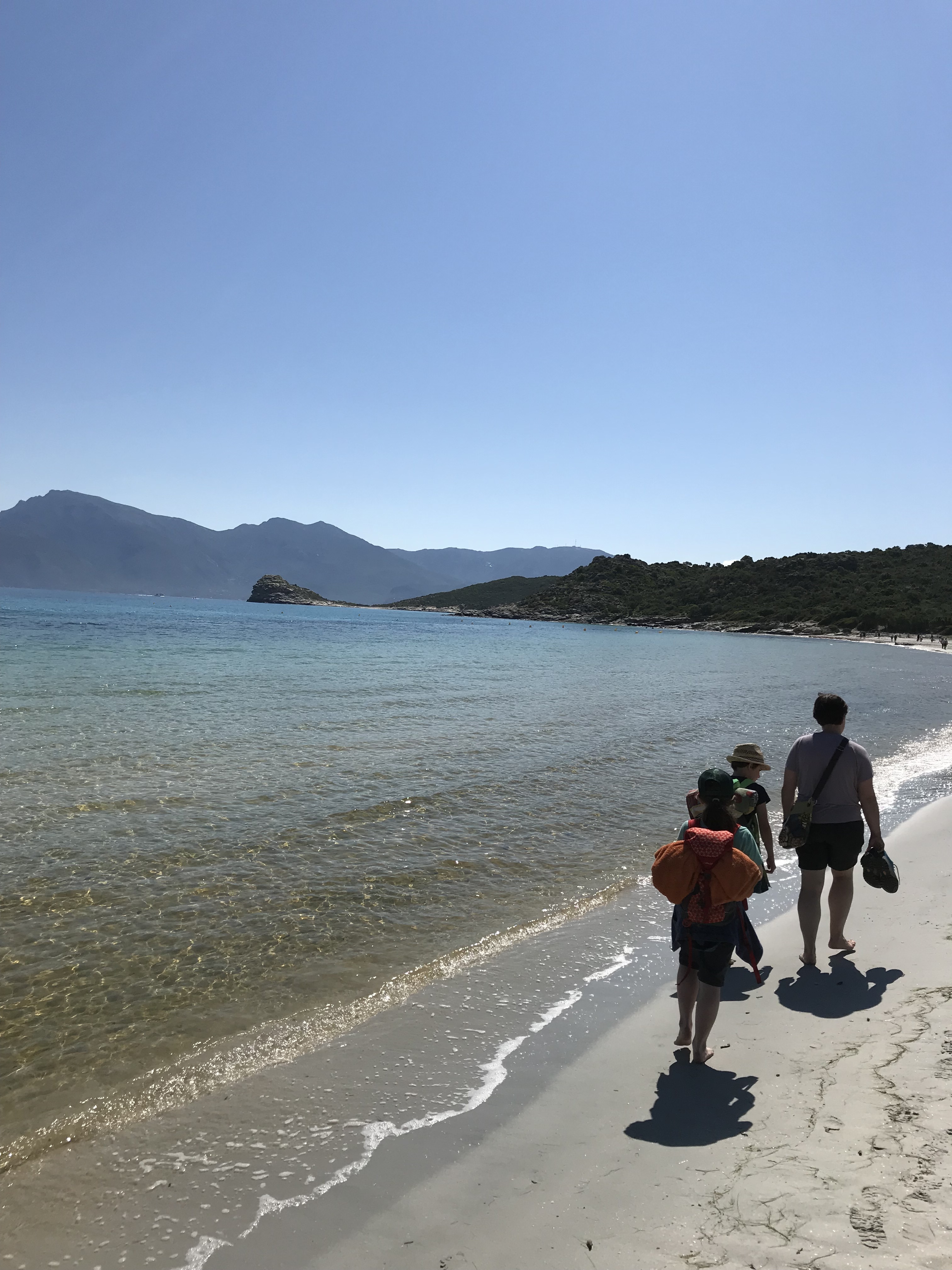 Teile der Familie trauen sich mehrmals ins türkisfarbene Meer, ich bleibe aus Sicherheitsgründen am Strand und teile mein Schinkensandwich mit dem Hund. Die letzte Bucht vor dem Ziel zieht sich dann doch etwas elendig und wir fallen leicht erschöpft um 19:00 in die Hafenpizzeria von Saint-Florent.