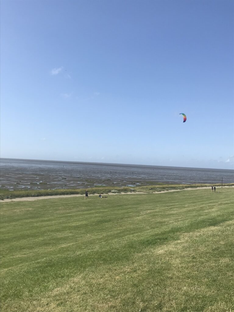 Regenschauer vorbei und wir fahren die restlichen 15 Minuten nach Friedrichskoog-Spitze. Dort dann endlich richtig Nordsee, mit irre viel Wind und jemand hat das Wasser abgelassen. Das mit Ebbe und Flut, sehr faszinierend.