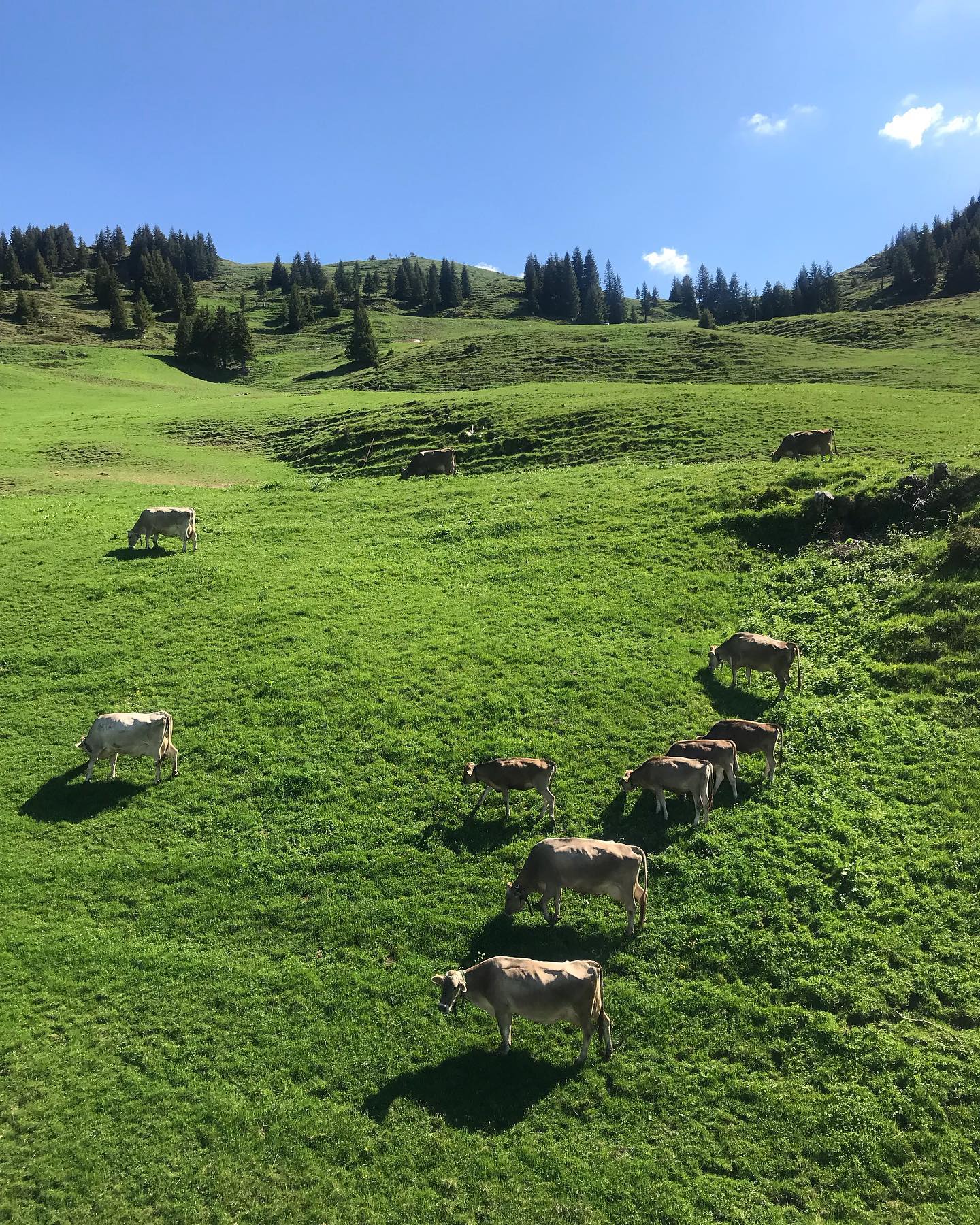 In Damüls fahren wir mit dem Uga-Sesselllift nach oben und sehen erst mal Kühe auf grüner Wiese. Weg