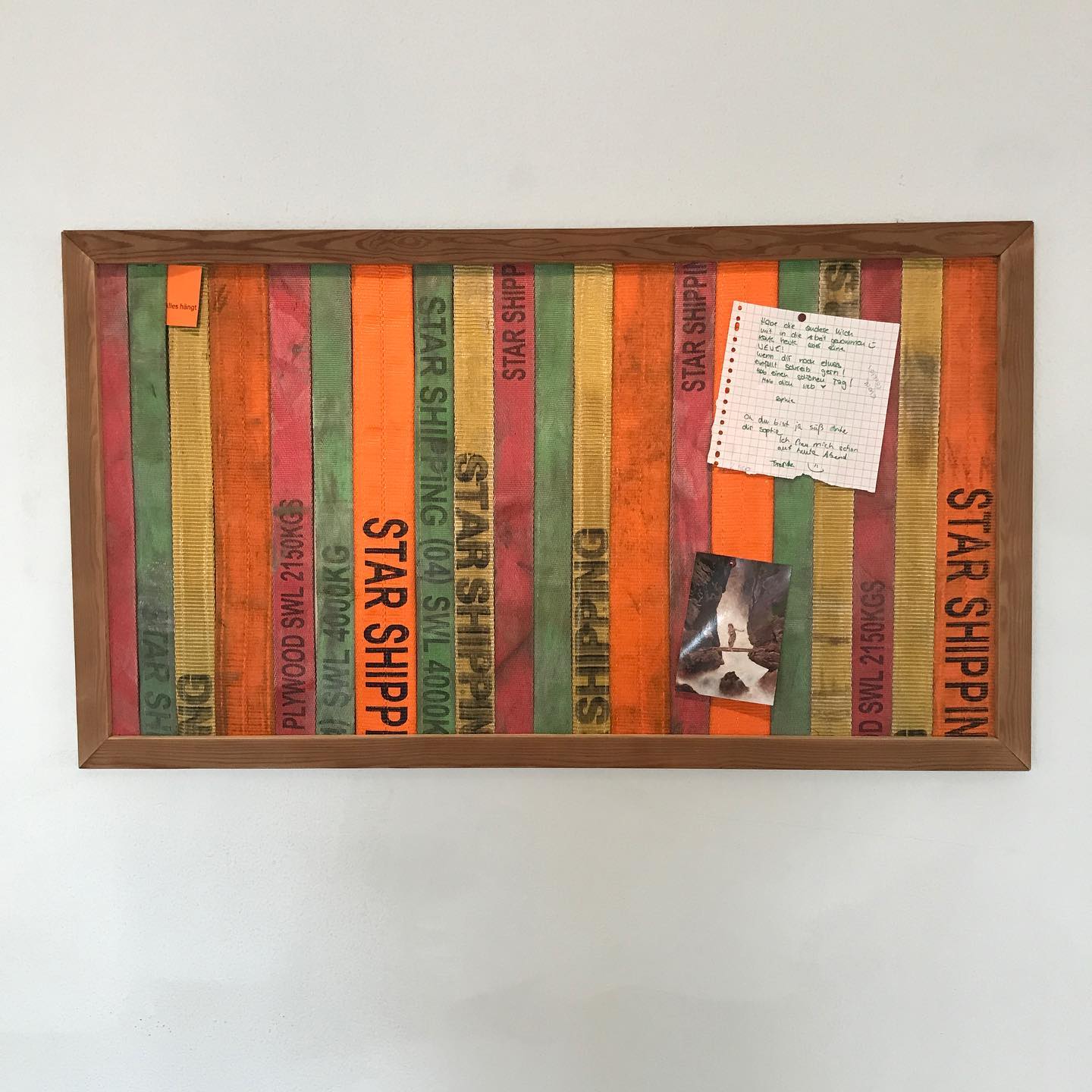 Die selbstgemachte Pinnwand besteht aus alten Container-Schiffsgurten, die der TÜV nicht mehr durchgewunken hat. Die Gurte eigenen sich gut für Stecknadeln und man kann gleichzeitig Zettel dazwischen klemmen.
