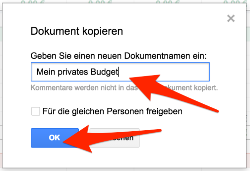 Melden Sie sich bei Google an und klicken sie auf diesen Link. Die Haushaltsbuchvorlage öffnet sich. Klicken sie auf „Datei“->“Kopie erstellen“ und vergeben Sie einen Namen für ihr Haushaltsbuch. Danach haben Sie in ihrem persönlichen Google-Account eine Kopie des Haushaltsbuches mit dem Sie ab jetzt arbeiten.