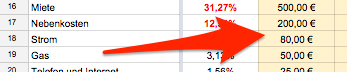 Bei den Ausgaben (und den Einnahmen) gibt es eine Spalte, die anzeigt, wie viel Prozent der Gesamtkosten eine Kostenstelle einnimmt. Außerdem kann man durch einfaches entfernen von einzelnen Werten sofort die Auswirkungen auf das Gesamtbudget sehen und sich somit überlegen, wo man am besten Geld einsparen kann.