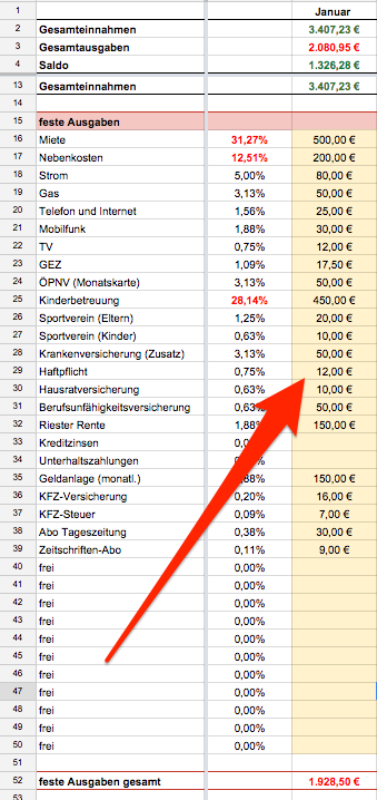 Schritt 3: Feste Ausgaben erfassenJetzt erfassen wir alle regelmäßigen Ausgaben. In der Tabelle sind die gängigsten bereits eingetragen (Miete, Versicherungen …). Die Bezeichnungen können beliebig geändert werden und es gibt noch einige Einträge, die mit „frei“ gekennzeichnet sind. Kostenposten, die Sie nicht benötigen, können sie einfach leer lassen. Ausgaben, die Sie nicht monatlich, sondern z.B. jährlich begleichen, rechnen Sie auf einen Monat um. Die KFZ-Versicherung, die jährlich 150 € kostet, wird jeden Monat mit 12,50 € eingetragen.