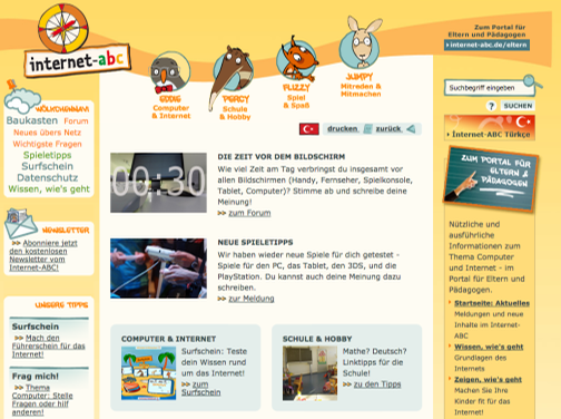 Das Internet-ABC wird von einem eigenen Verein betrieben, der von zahlreichen Landesmedienanstalten unterstützt wird. Die Seite richtet sich speziell an Kinder im Alter zwischen 6 und 12 Jahren. Die Tiere Eddy, Percy, Flizzy und Jumpy nehmen die Surfanfänger bei der Hand und erklären alles Wichtige zum Thema Internet. In einem interaktiven Spielkönnen die Kinder ihren Internet-Führerschein machen und imElternbereich gibt es umfangreiche Informationen für die Erziehungsberechtigten.