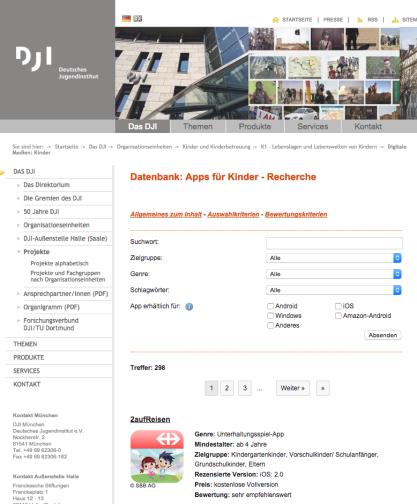Das deutsche Jugendinstitut in München pflegt eine umfangreiche Datenbank mit Software und Apps für Kinder. Die Besprechungen, die von Medienpädagogen erstellt werden, sind ausführlich und hilfreich. Man kann die Datenbank sehr differenziert nach unterschiedlichen Kriterien, wie z.B. Betriebssystem, Jugend- und Datenschutz, Werbung, Genre oder Zielgruppe durchsuchen. Die umfangreiche Sammlung scheint auf einem aktuellen Stand zu sein.