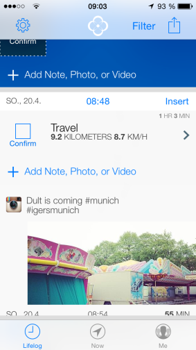 Narrato unterstützt lediglich Facebook, Twitter, Instagram, Foursquare und Moves. Um die App zu nutzen, muss man sich zusätzlich einen Narrato-Account zulegen. Man kann dann sein Lifelog privat führen oder auch für andere Nutzer freigeben. D.h. die aggregierten Daten werden auf den Servern des Anbieters zwischengespeichert. Ähnlich wie bei Momento und Saga kann man zusätzlich von Hand Tagebucheinträge anlegen.