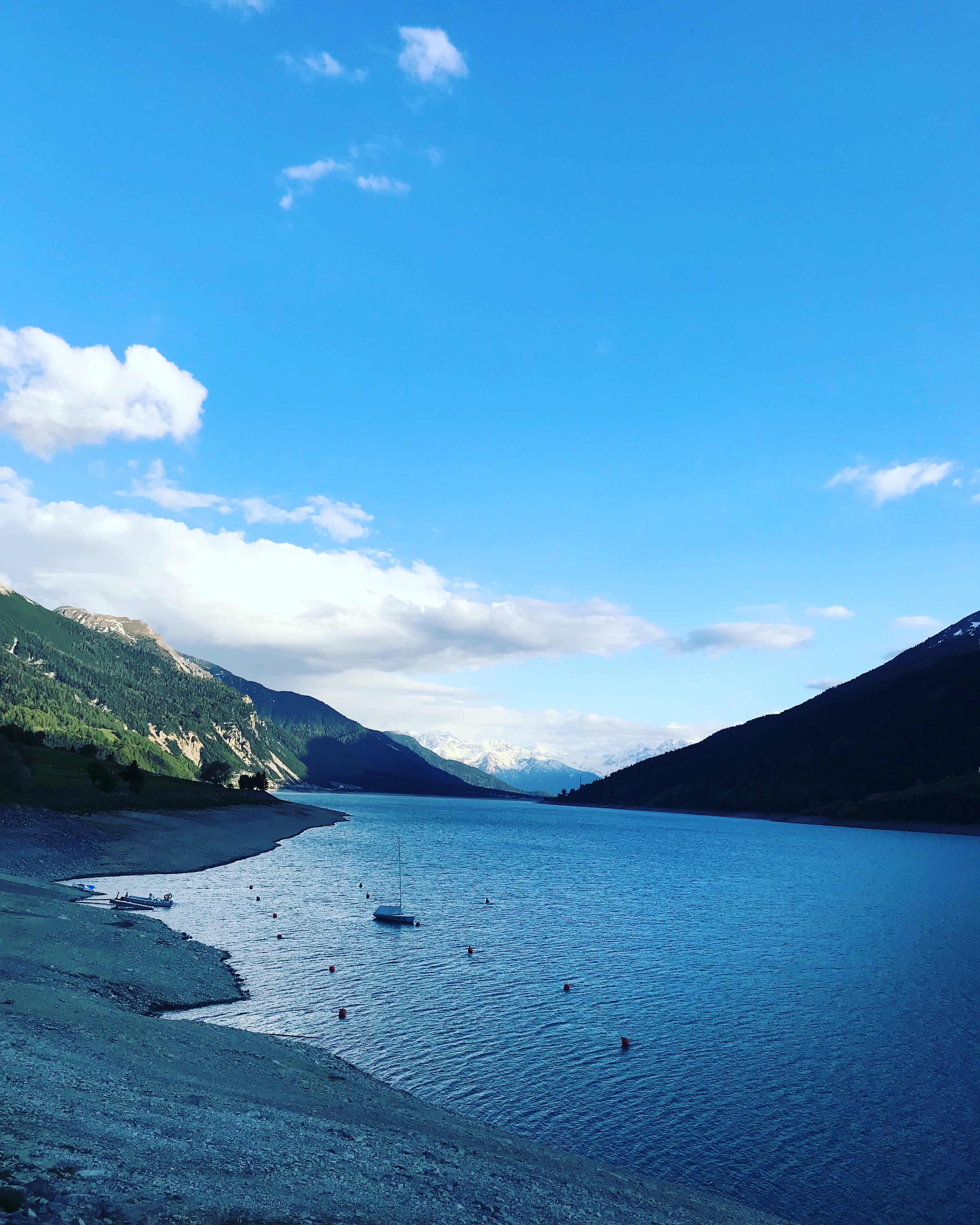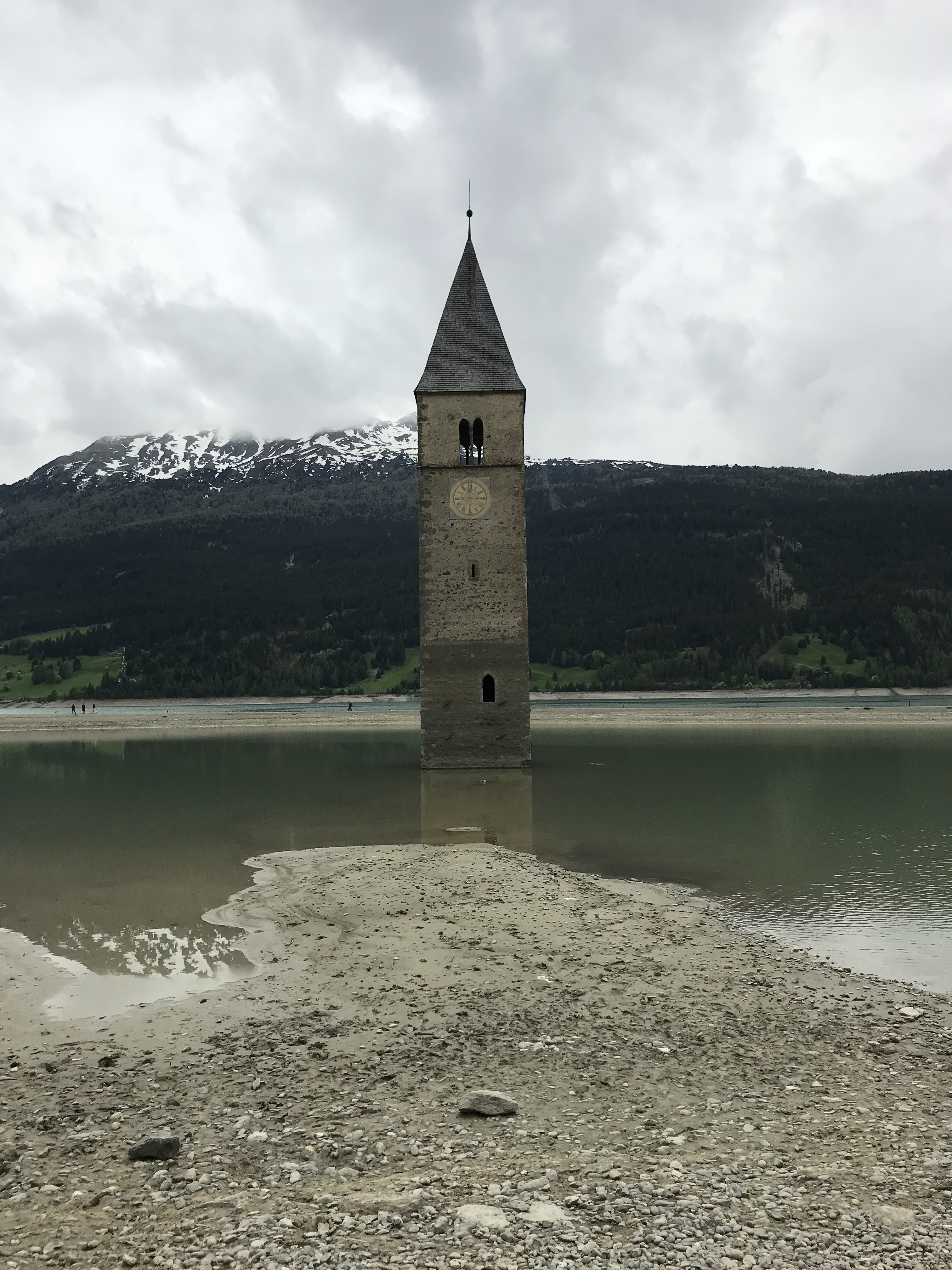 Dieses mal haben wir für die Anreise bereits zwei Übernachtungen eingeplant. Es sind Pfingstferien und natürlich sind wir nicht die Einzigen, die nach Süden wollen. Deshalb geht es am Freitag gleich Nachmittags los bis zum Reschensee in Südtirol. Dort übernachten wir in einem kleinen, zweckmäßigen Appartment. Im Reschensee steht ein alter Kirchturm mitten im Wasser. Das wirkt etwas skurril und lustig, aber die Geschichte dahinter ist leider ziemlich bitter und handelt von Vertreibung und Enteignung durch italienische Faschisten, die das Tal geflutet haben um Strom zu gewinnen.