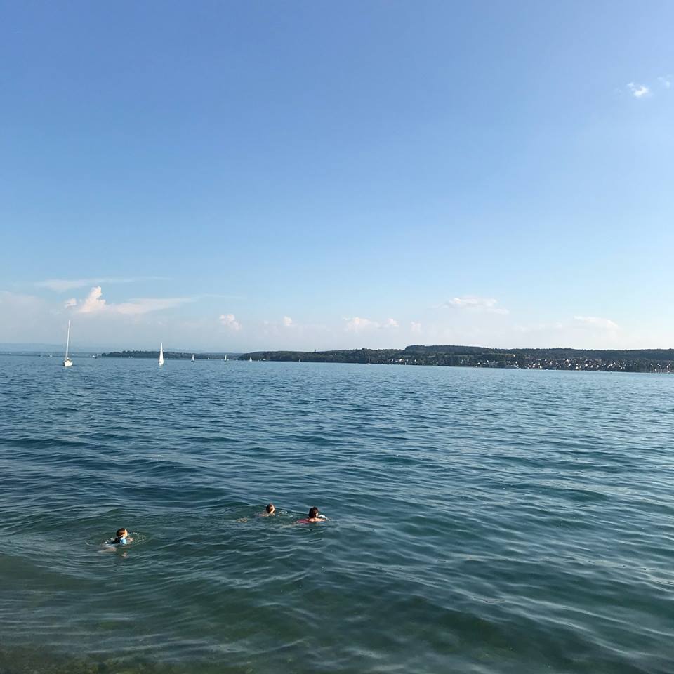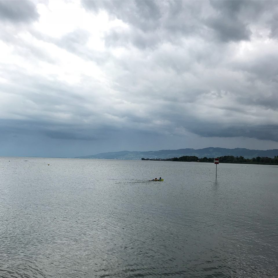 - Baden im See. Diesmal mit Luftmatratze. Das Wasser auf schweizer Seite ist deutlich wärmer, weil die Gemeinden so reich sind, dass sie den See mit riesigen Tauchsiedern (rechts im Bild) auf Badewannentemperatur erwärmen können.