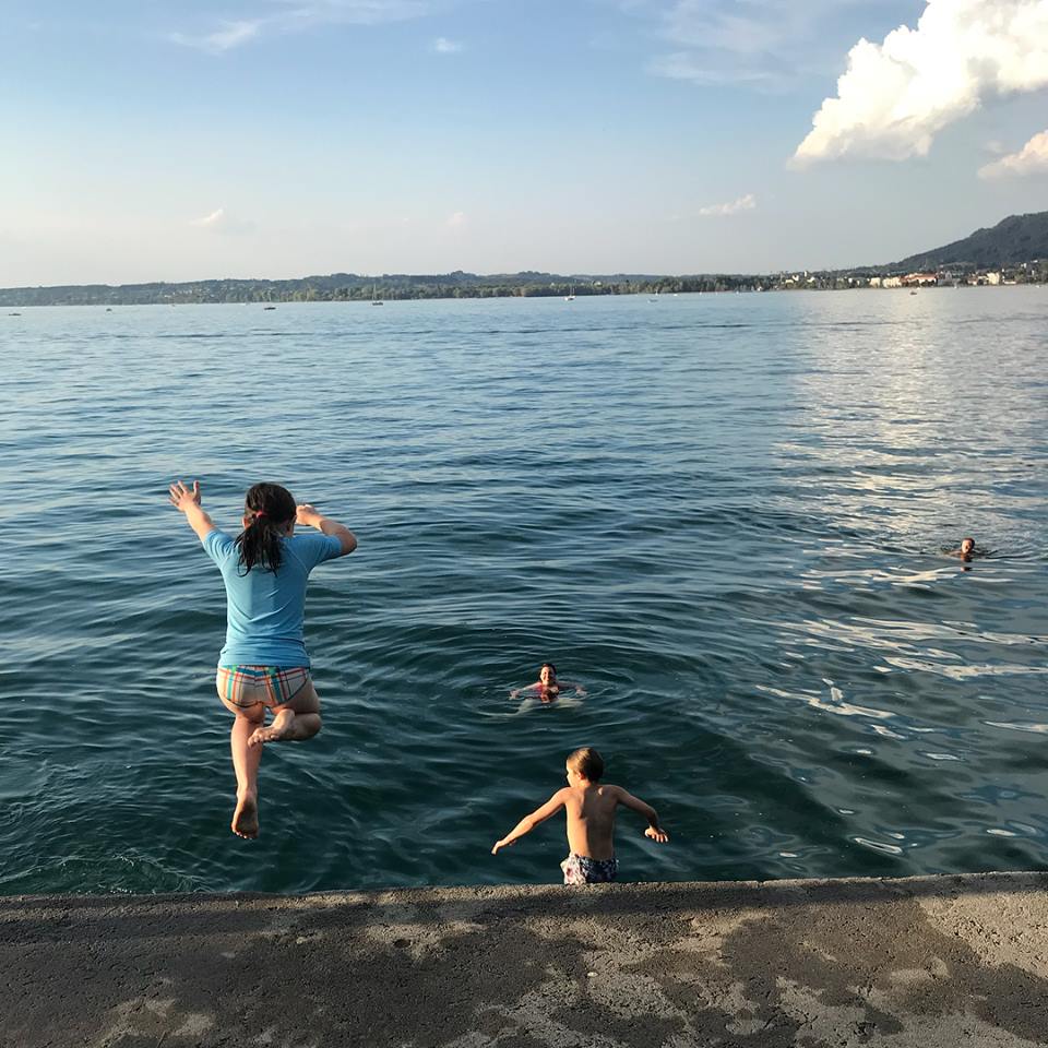 In Bregenz springen dann alle noch mal in den See. Die Kinder sogar von der 3-Meter-Kaimauer (ich, aus medizinischen Gründen, nicht)