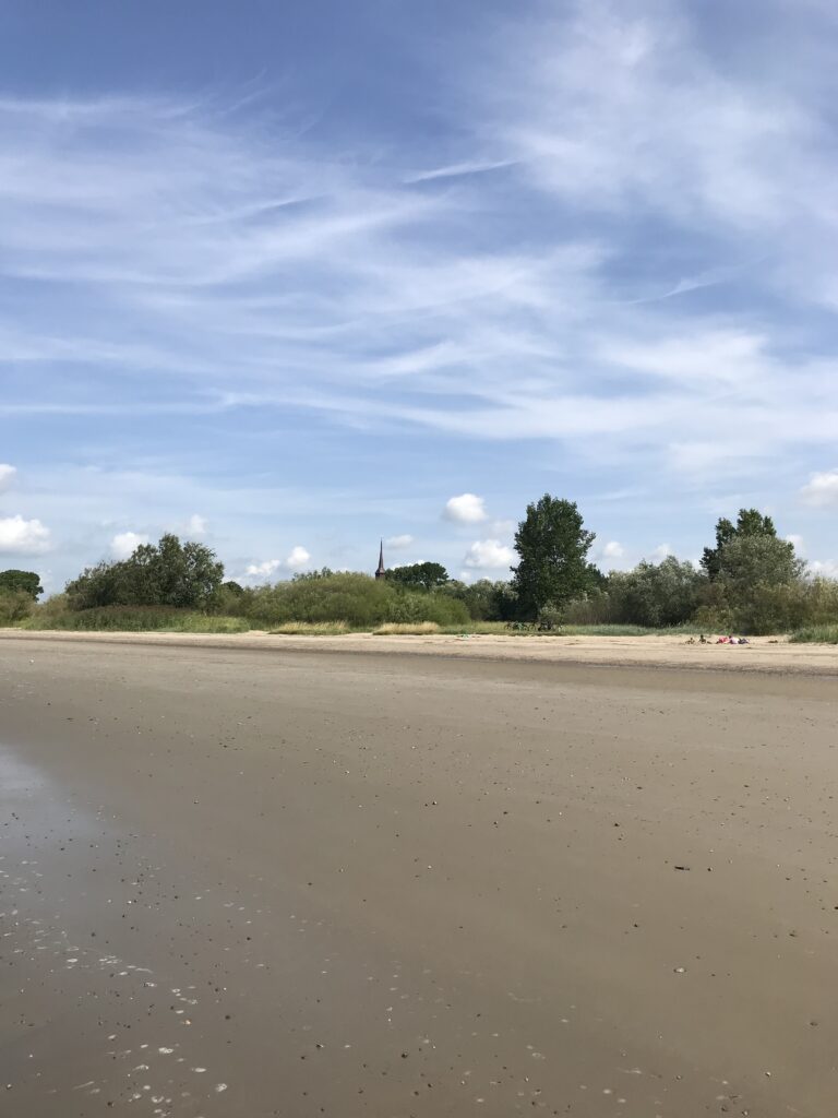 Wir sind aber linksgrünguter Gesinnung und werden durchgelassen zum Brokdorfer Elbstrand. Wenig los, strahlend schön.