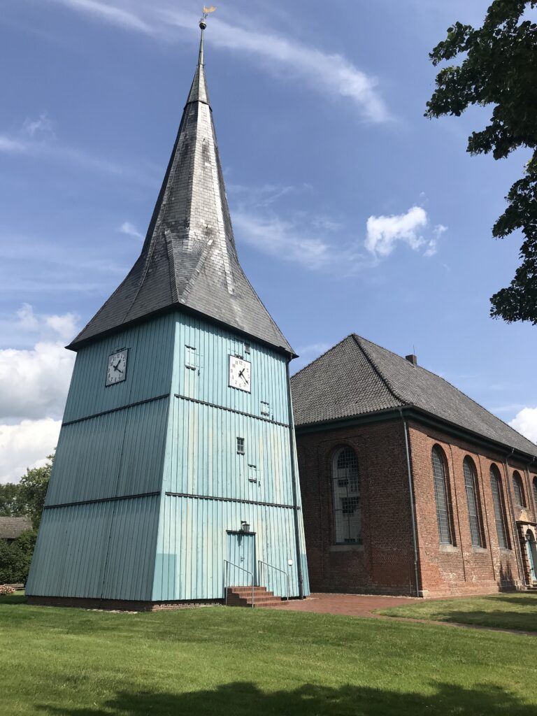 - Der Kirchturm ist blau.