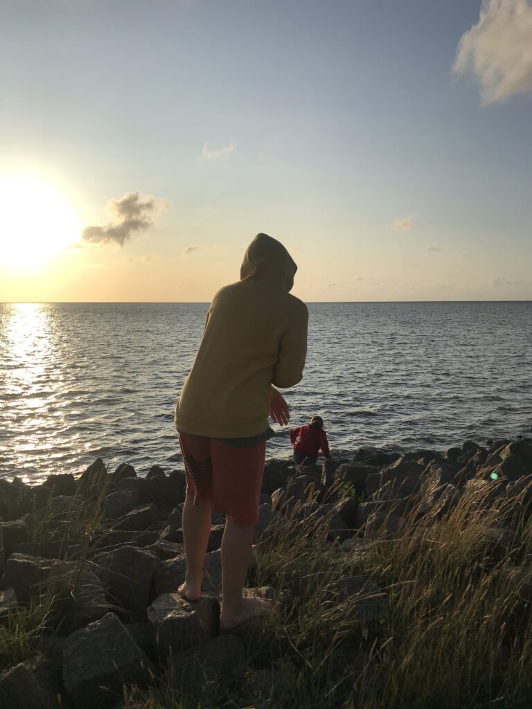 Regenschauer vorbei und wir fahren die restlichen 15 Minuten nach Friedrichskoog-Spitze. Dort dann endlich richtig Nordsee, mit irre viel Wind und jemand hat das Wasser abgelassen. Das mit Ebbe und Flut, sehr faszinierend.