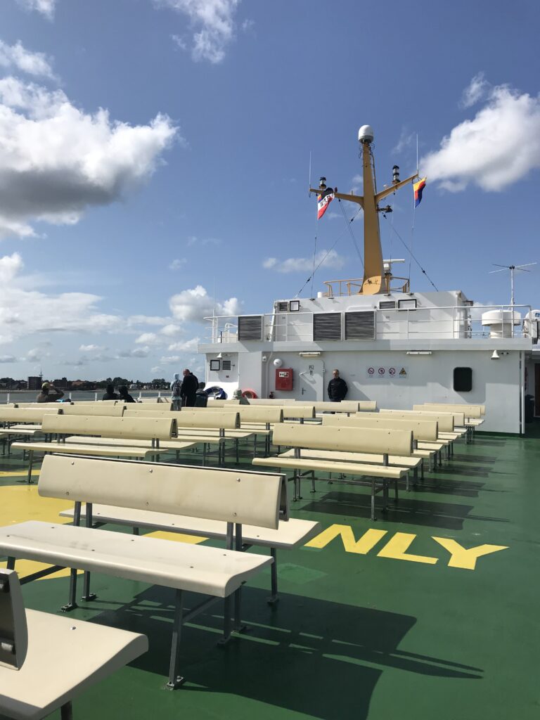 Weil es in Husum den ganzen Vormittag geregnet hat, haben wir uns entschieden den Zug zu nehmen. Man fährt bis Niebüll und steigt dort um in den Zug nach Dagebüll. Der Bahnhof ist dort direkt neben dem Fähranleger und man muss die Räder nur schnell rüberschieben. Die Fähre fährt den ganzen Tag im 1-2-Stunden-Takt und man muss mit den Rädern nicht vorbuchen, sondern kann spontan zusteigen.