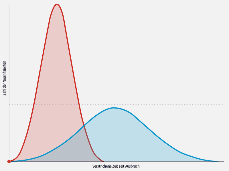Die rote Kurve zeigt eine sehr schnelle Ausbreitung an. Das Problem daran ist: Wenn ganz schnell, ganz viele infiziert sind, dann sind auf einen Schlag auch sehr viele (zu viele) schwere Verläufe, die ins Krankenhaus müssen und die Krankenhäuser sind dann überlastet (und das betrifft dann ALLE Patienten, nicht nur Corona-Infizierte). Wenn sich die Ansteckungen besser übers Jahr verteilen (blaue Kurve), dann haben die Krankenhäuser auch mehr Luft.